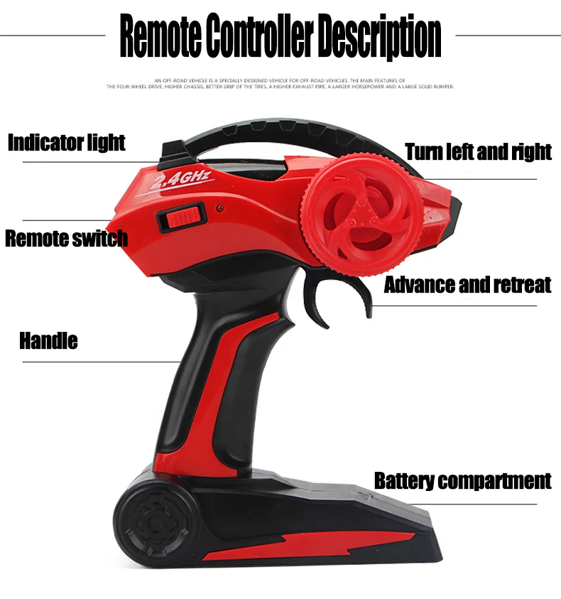 C.20cm size version, ratio 1:20, 2WD without LED lights, remote control range about 10m.