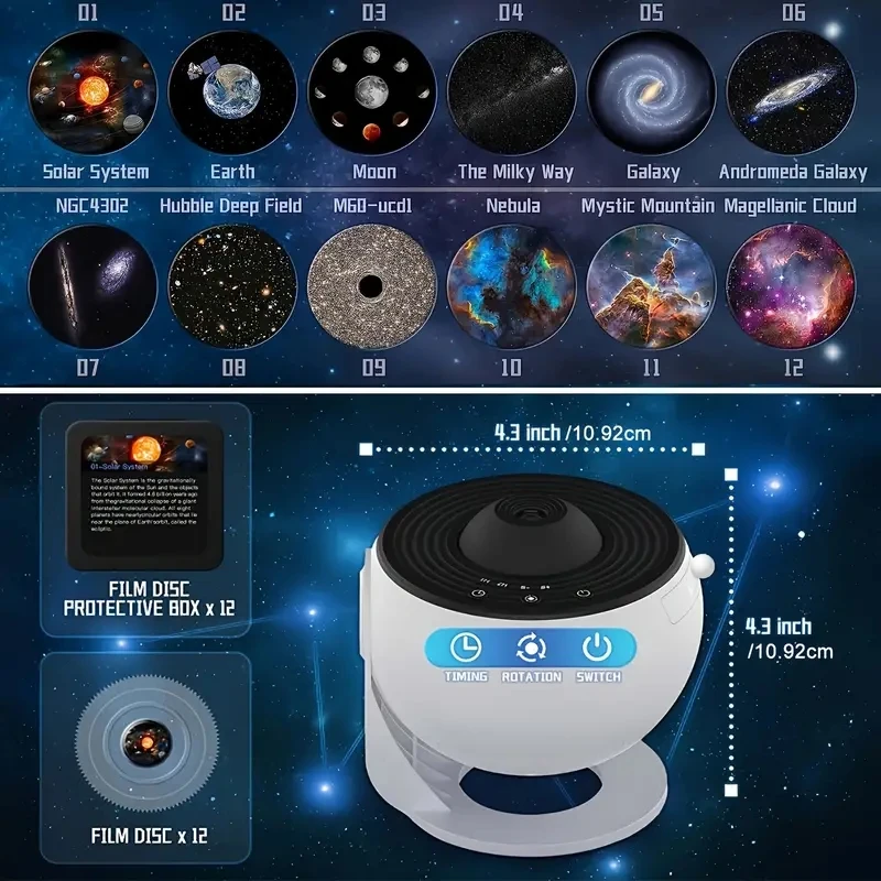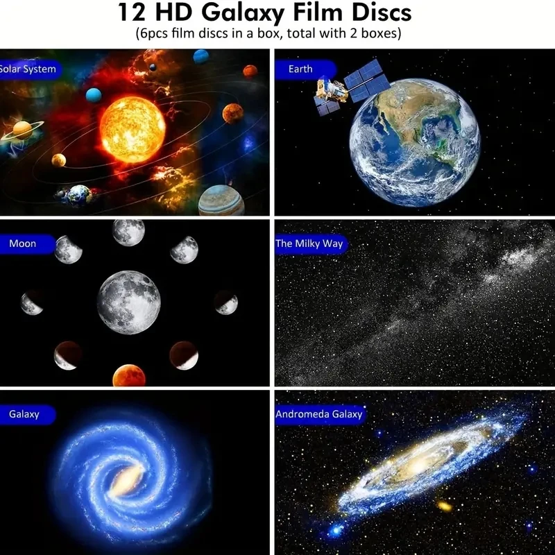 【12 IN 1 Realistic Planetarium Projector】– This galaxy projector for bedroom comes with 12 display scenarios: Solar System, Earth, Moon, The Milky Way, Galaxy, Andromeda Galaxy, NGC4302-NGC4298, Hubble Deep Field, M60–UCD1, North America Nebula, Mystic Mountain, and Small Magellanic Cloud