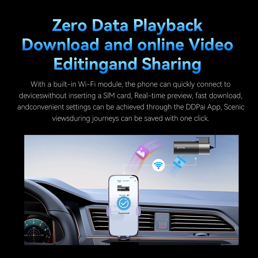With a built-in Wi-Fi module, the phone can quickly connect to devices without inserting a SlM card. Real-time preview, fast download, and convenient settings can be achieved through the DDPai App. Scenic views during journeys can be saved with one click, and key evidence can be backed up in seconds. lt is easy to operate and does not consume data!