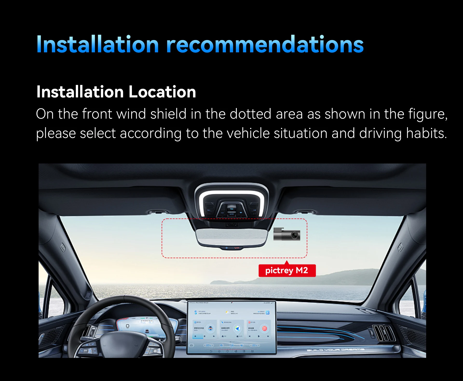 After selecting the installation position, install the electrostatic sticker first and then install the bracket. Connect the bracket firmly with the recorder and then paste the recorder. Paste the recorder into the dotted line box of the electrostatic sticker. After the installation is completed, connect the power line to the power supply, arrange the power line near the cigarette lighter and connect the charging head, and then insert the cigarette lighter.