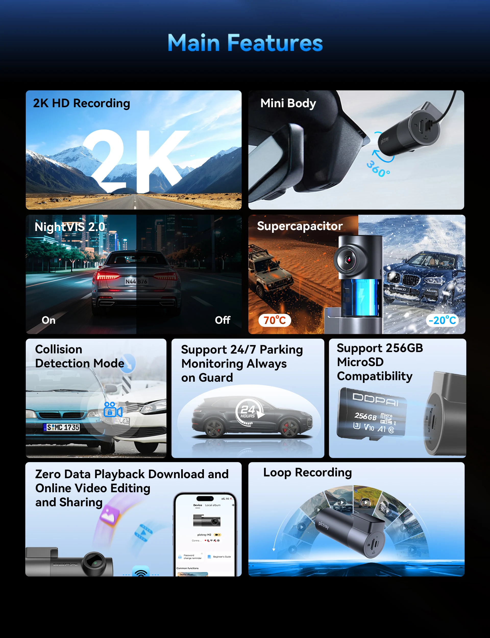 With support for 256GB MicroSD cards, M2 ensures ample space for continuous 2K recording, Perfect for long drives and extended parking monitoring, it keeps your footage safe and uninterrupted.