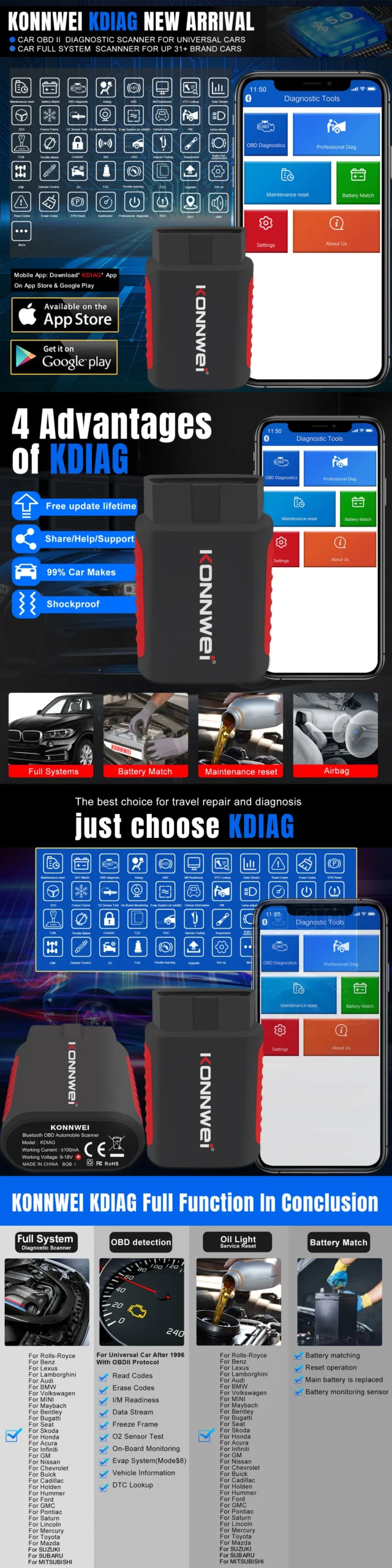 Multiple maintenance function: KONNWEI KDIAG OBD2 fault scanning tool has multiple maintenance functions, including oil reset, battery match, electronic parking system, tire pressure monitoring system, fuel injection nozzle, throttle adjustment, IMMO, ABS system, gear learning, suspension matching, sunroof, etc. We will add more reset function sooner later such as EPB rese t, TOMS reset , DPF reset , throttle reset etc…. It will save your time, repair time and cost.