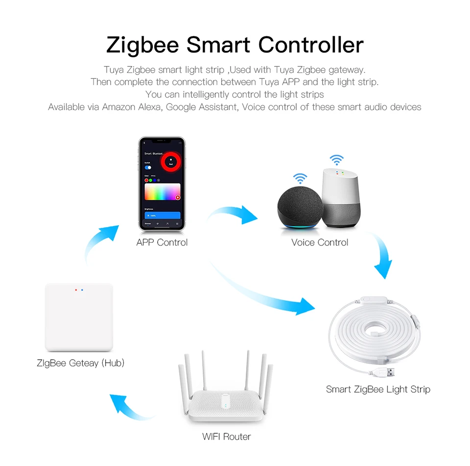 2.Zigbee 3.0 LED Controller. It can't work without Hue Bridge, Tuya Gataway or SmartThings. Compatible with general Zigbee bridge or coordinator and more stable and convenient connection with ZigBee Gateway.Work with Tuya Bluetooth/WiFi Dual-Mode Gateway,it can Support Third Part Voice Control like Alexa,Google Home.
