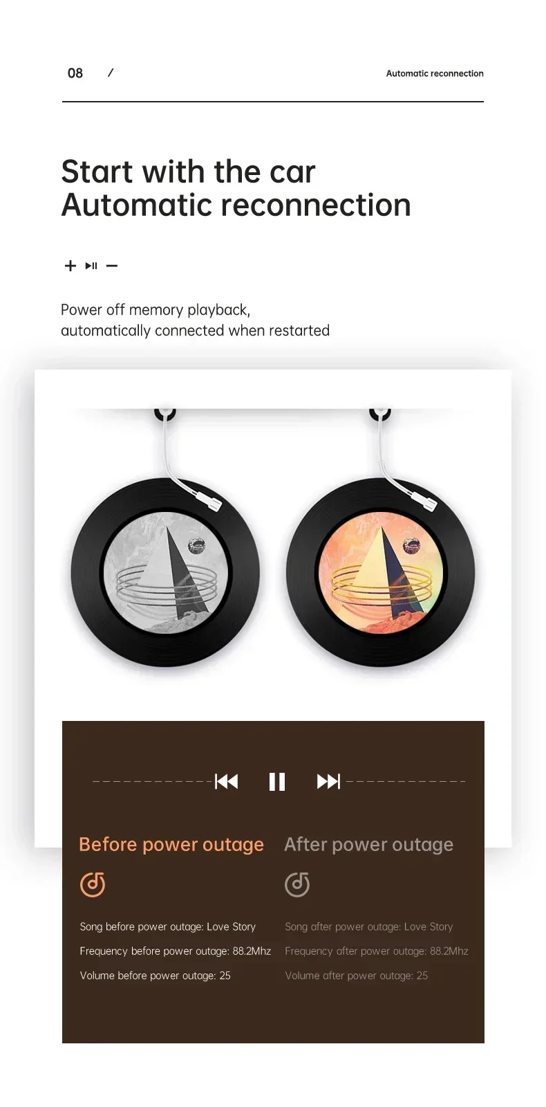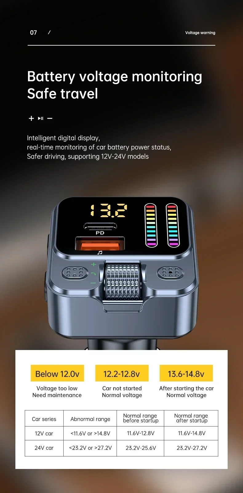 2. Automatic detection of car battery voltage, voice reminder, intelligent digital display