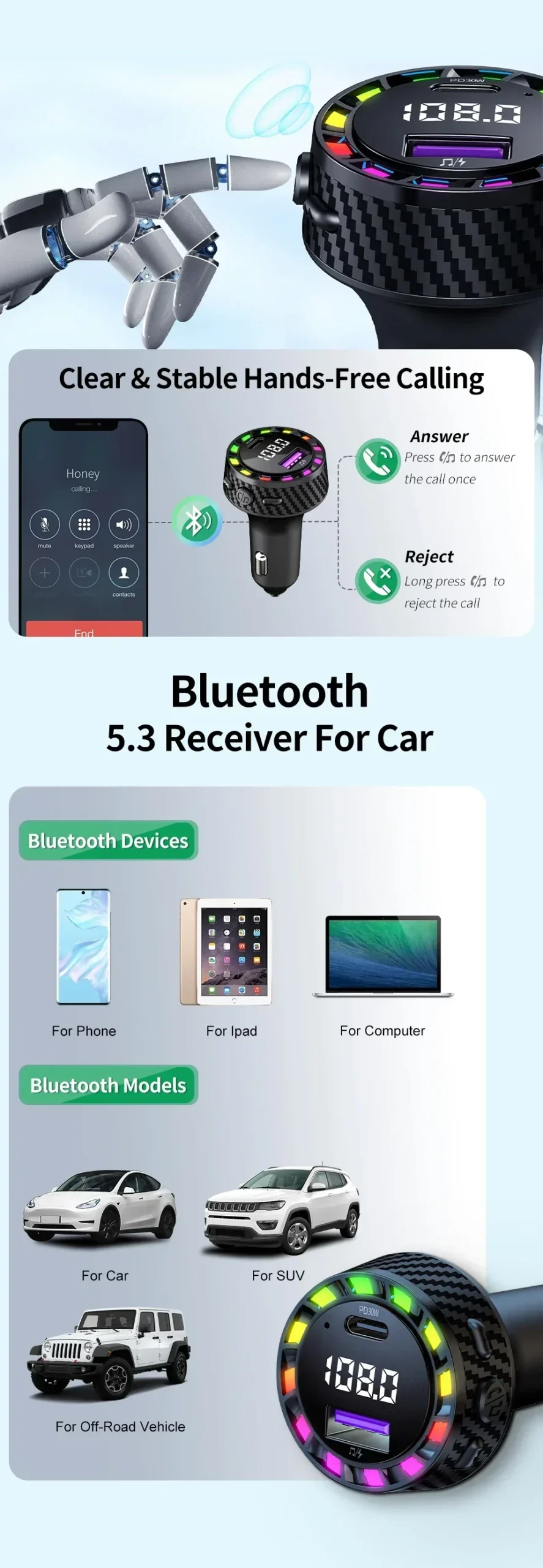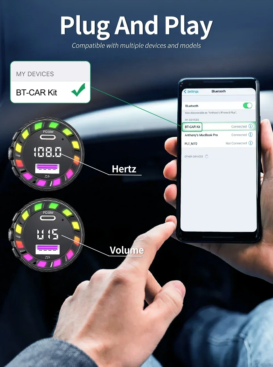 Car Bluetooth FM Transmitter Charger PD 30W Fast Charging USB Type C MP3 Player Handsfree Call Wireless Car Kit with LED Light