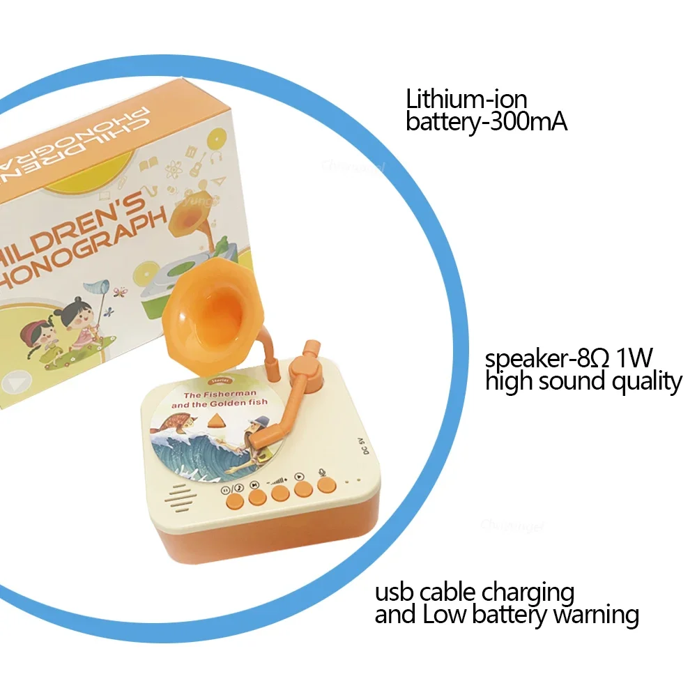 2.   Interactive Kids Phonograph for Learning and Fun:  Ideal for educational play, it enhances early learning while keeping kids entertained. The children gramphone has 96 different cards includes 43 stories, 8 aesop's fables, 26 song, 14 classical music, 1 collection of songs and 4 DIY cards. The DIY cards can can record your own voice.