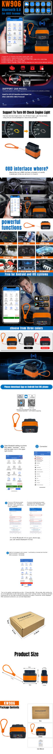 KW906 bluetooth car OBD2 code reader applies for all 12V gasoline and Diesel vehicles/hybrid electric vehicles, it's a 16 Pin plug that plugged into the vehicle OBD port.