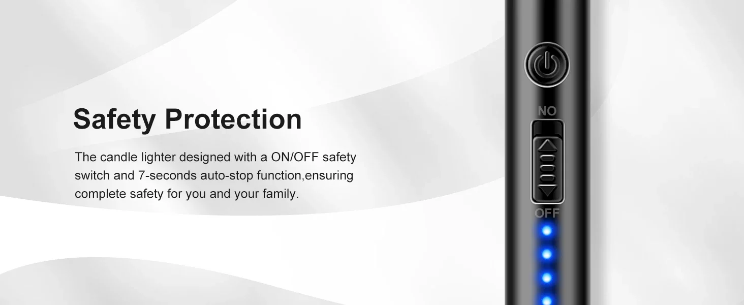 Enhanced Safe and Efficient: This candle lighter not only upgraded auto power-off function after 7 seconds to ensure maximum safety, but also adds an external safety lock switch to prevent accidental ignition. Windproof arc lighters without gas or flame, let you safely light candles, grills, stoves and more