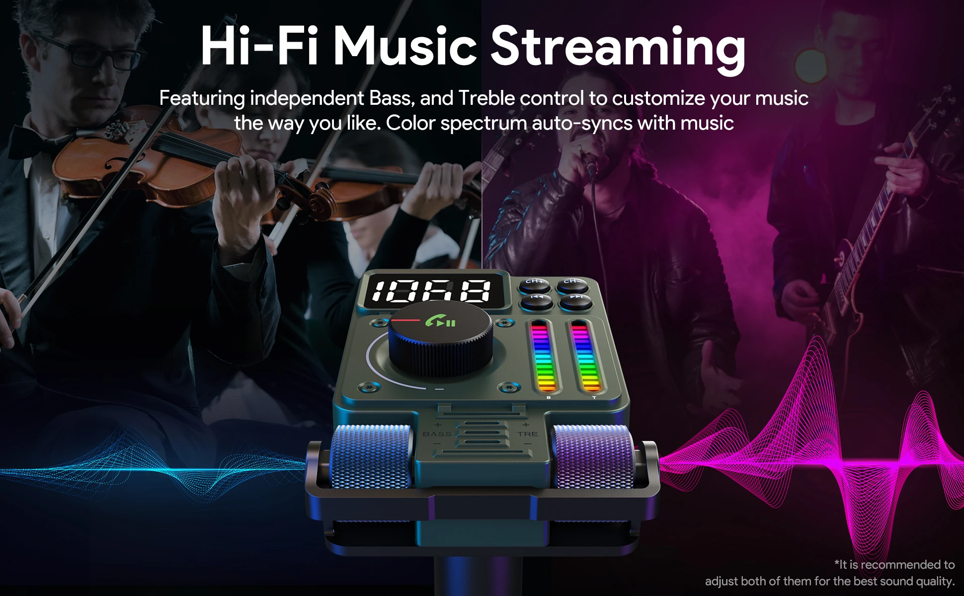 🎶【Unique Hi-Fi Treble and Bass Control】LENCENT FM Transmitter features independent volume, bass, and treble control to get more details of the Hi-Fi music. You can find your favorite music experience by adjusting the treble and bass, and enjoy audiophile grade sound that brings to you. The color spectrum auto-syncs with music, truly brings you party atmosphere(can be turn off).