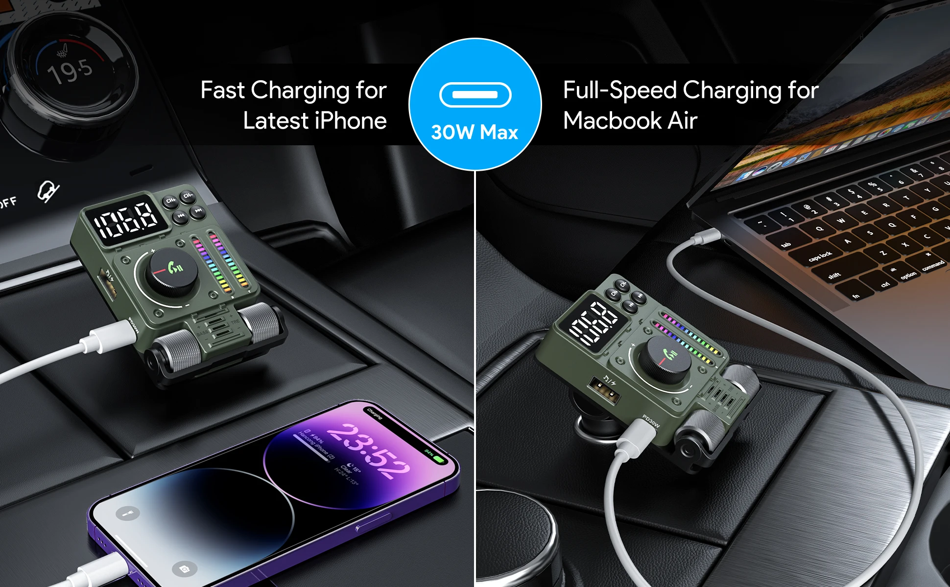 Dual USB ports allow you to charge 2 devices at the same time and provide high-speed charging to driver and passenger. Single USB-C PD port (30W Max) can either charge an iPhone from 0–85% in 30 minutes, or power your MacBook Air M2 2022 with full speed. Another USB port is 5V/2.4A, can charge devices as well as can read music files in U disk(≤64GB), supports MP3, WMA, WAV, APE and FLAC format.