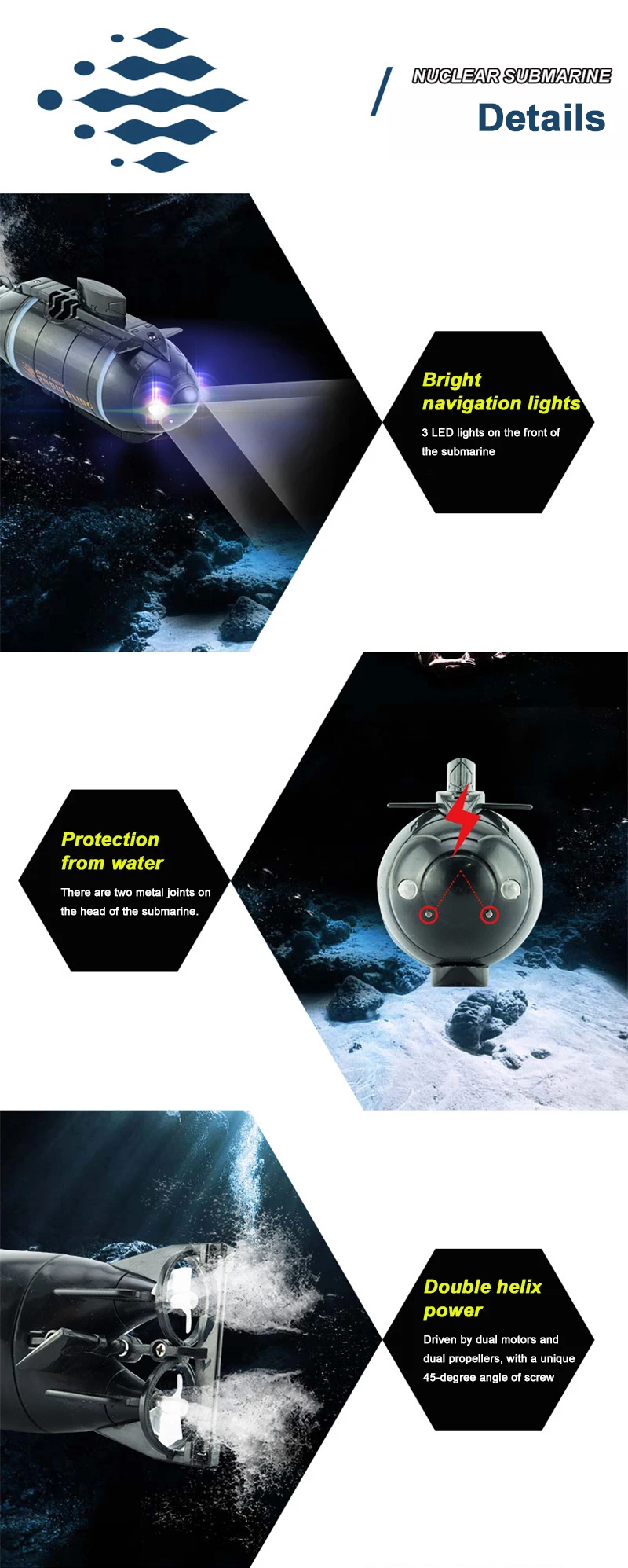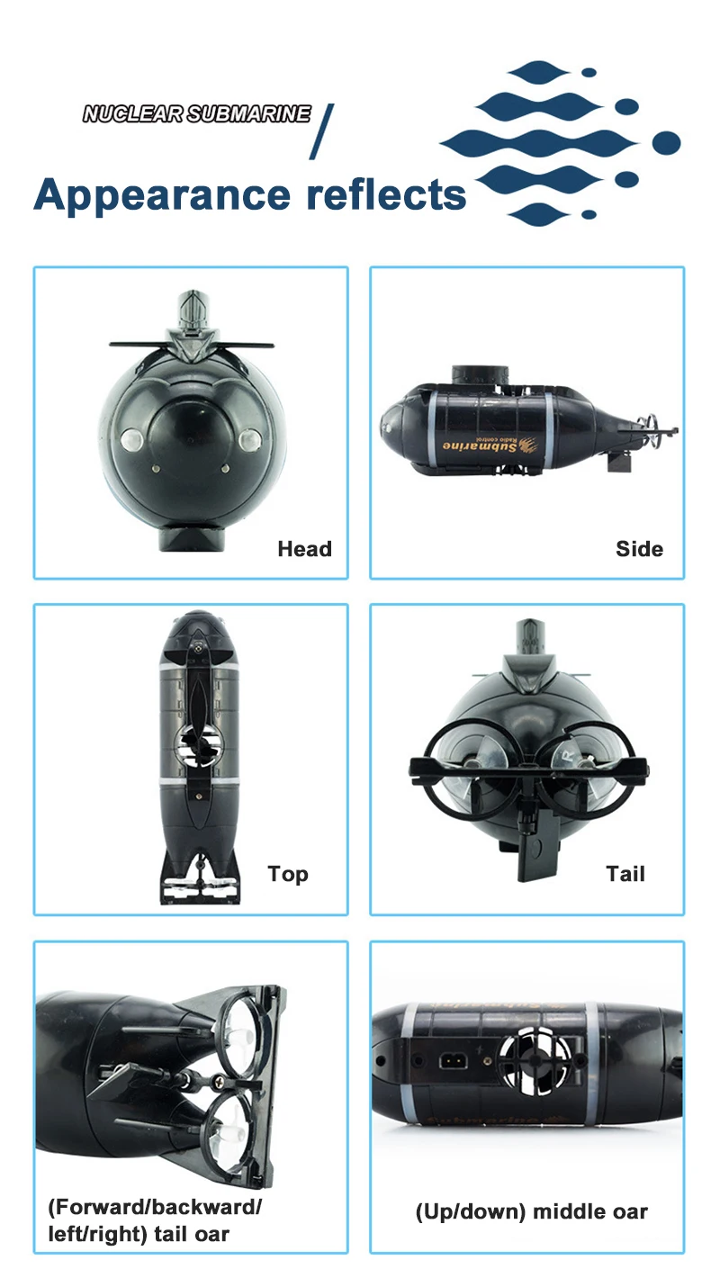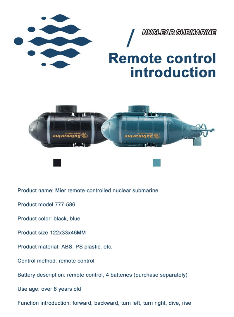 4.Control Functions: Forward or backward, turn left or right, dive, float upward and glow! Just like a real submarine sailing in the ocean.