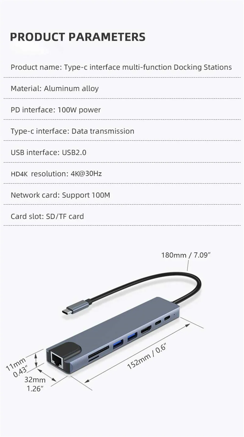 8 in 1 Docking Station USB 3.0 2.0 C Hub Concentrator: USB3.0,USB2.0,USB-C data,Audio,TF,SD