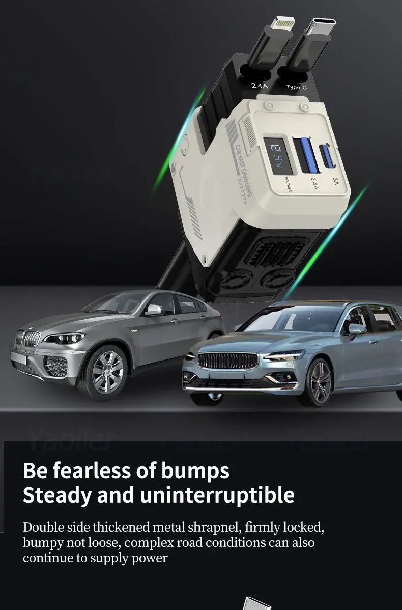 NEW 120W Car Charger 4 in 1 Retractable Car Cigarette Lighter Adapter USB Type C Fast Charging Cable for iPhone Huawei Samsung
