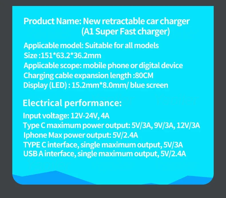 Product Name: New retractable car charger(A1 Super Fast charger)
