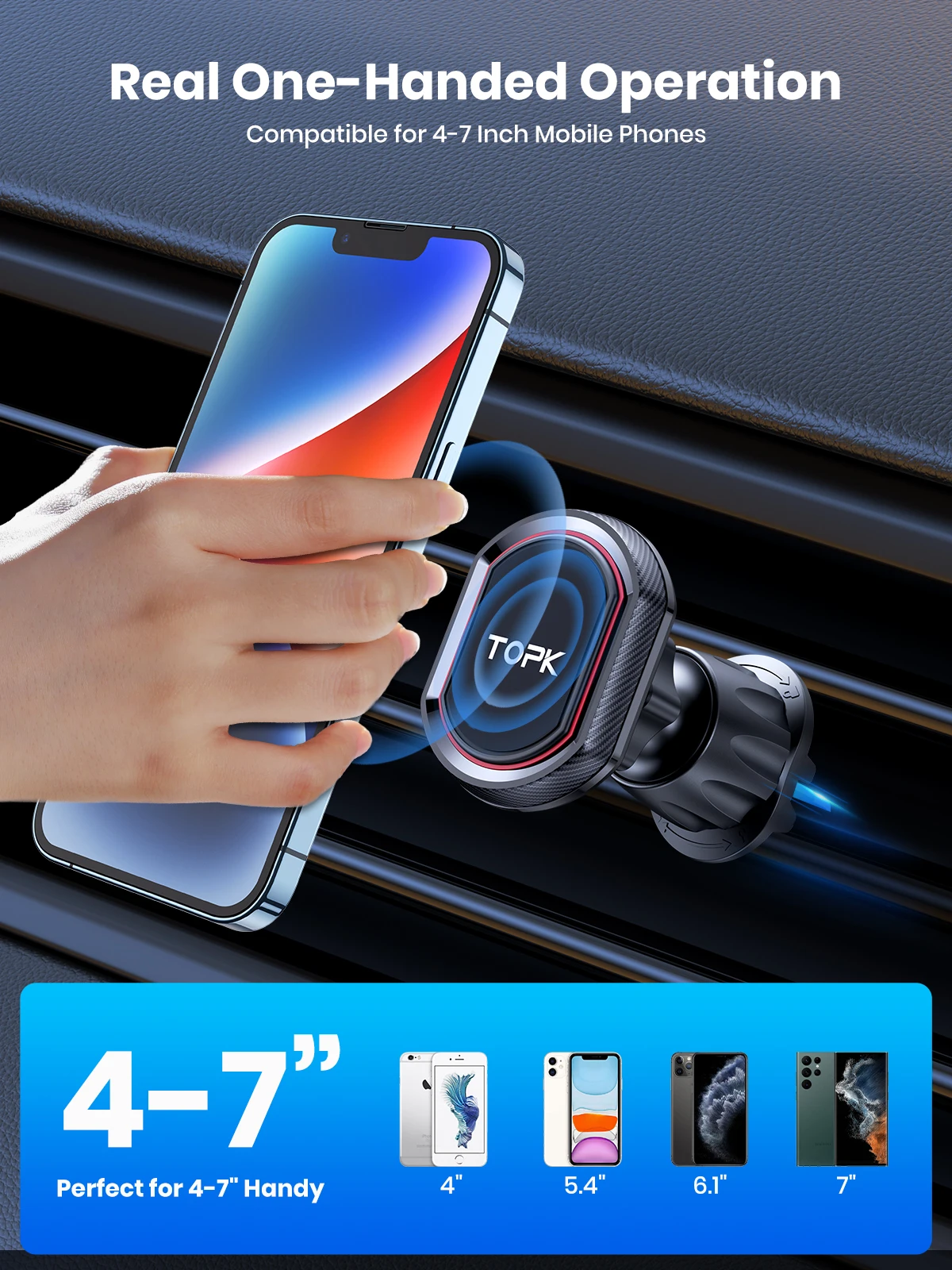 👍 CONVINCING QUALITY & UNIVERSAL COMPATIBILITY: TOPK car phone holder won SGS RoHS & SGS CP65 official certification and passed the magnetic force, telephone signal, hook stability and ingredient safety test. Quality is strictly controlled. The car holder holds most smartphones and mini tablets compatible with iPhone 15 14 13 12 11 pro max / XR / X / 8/7/6/5, Note 9 / Galaxy Note20 U, S23 S22 S21 S20 S10 S9 S8 S7 S6, iPad Air 2 / Mini 3 / Pro 9.7 and more. This product cannot work with MagSafe.