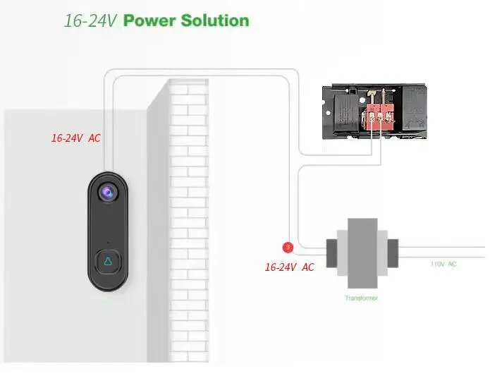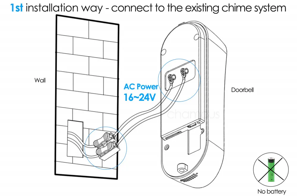 *Connecting the WiFi doorbell camera with your existing doorbell wire and terminals, and connect the additional hooks to the screws on the back of the smart doorbell ( refer to the image)* No need battery* Either wire can be connected to the either terminals
