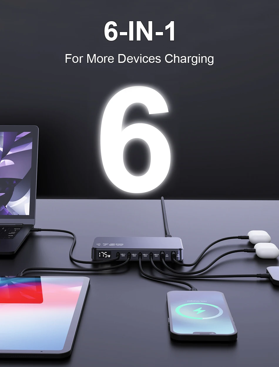 Our 175W charger is equipped with 6 ports (4 USB-C + 2 USB-A ports), of which the USB-C1/C2/C3 ports support a maximum of 100W output, the C4 port supports a maximum of 20W output, and the 2 USB-A ports support a maximum of 60W output, so it can satisfy the fast charging needs of your multiple devices.