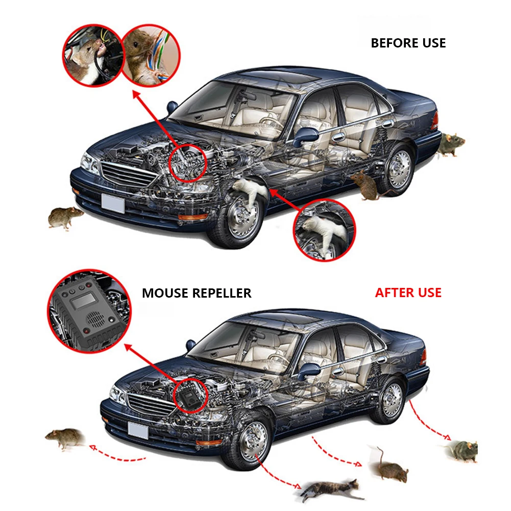 Ultrasonic Under Hood Animal Repeller 8 LED Strobe Lights Repellent Devices 12V/5V Powered Mouse Rat Repeller Ultrasound Alarm Intelligent Start-Stop Get Rid of Mice in Car Engine