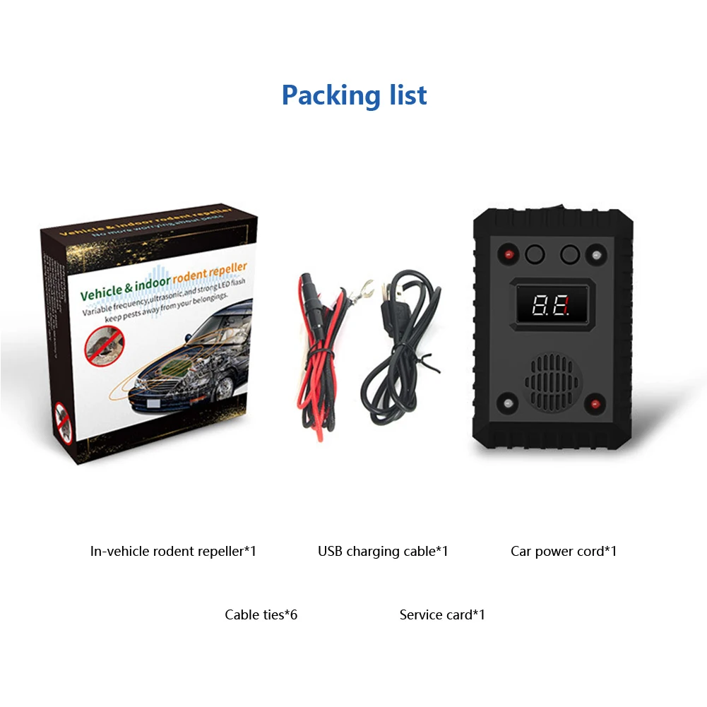 Feature: 1. Effective Deterrence of Various Animals: This under hood animal repeller is designed to repel multiple animals and keep them away from areas such as cars, warehouses, kitchens, and storage rooms. It provides a versatile solution to protect your property from unwanted intruders. 2. Intelligent Start-Stop Technology: With intelligent start-stop technology, this car rat repeller automatically turns on when your engine starts running and shuts off when the engine stops. It ensures low power consumption and long battery life, allowing your vehicle to remain protected even during extended periods of non-use. 3. High-Temperature Resistant Fireproof Material: Made from high-temperature resistant fireproof materials, this rodent repellent can withstand temperatures up to 230°C without burning. It guarantees safety and reliability, giving you peace of mind while using it. 4. Variable Frequency Ultrasonic Waves: The mouse deterrent utilizes variable frequency ultrasonic waves that automatically change frequencies, making it difficult for rodents to adapt and escape. The variable frequency ultrasonic waves generate sound interference that affects the rodents’ nervous system, becoming unbearable for them. 5. High-Power Ultrasonic Alarm with LED Flashing Lights: This rat deterrent features a high-power ultrasonic alarm that emits short bursts of alarming sound, startling rodents and preventing them from approaching. Additionally, the red and white flashing lights, with up to 8 LEDs, effectively deter rodents as they are sensitive to light stimulation. Specification: