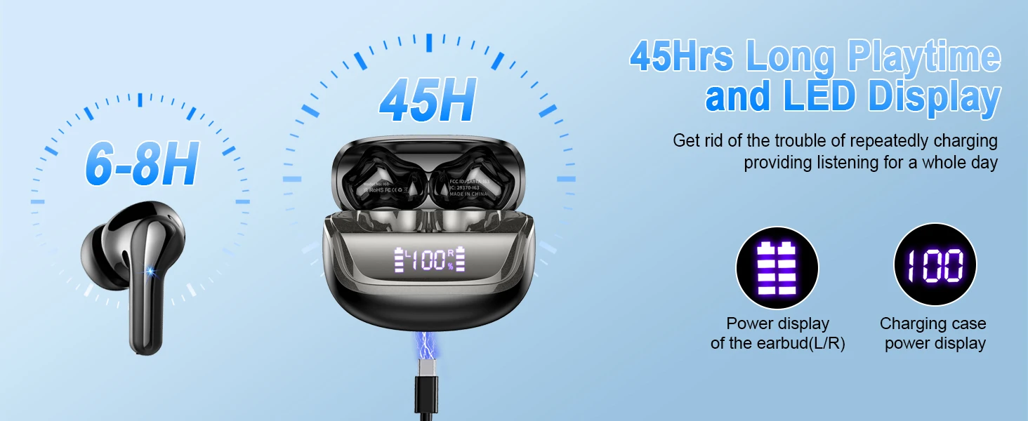 LED Power Display: The separate LED indicators for each earbud and the charging case provide clear visibility of battery levels, allowing users to manage their usage effectively.