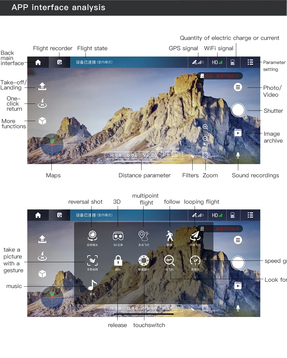 3. ① GPS intelligent tracking; ② Image following: Identify the shooting object and perform automatic following flight