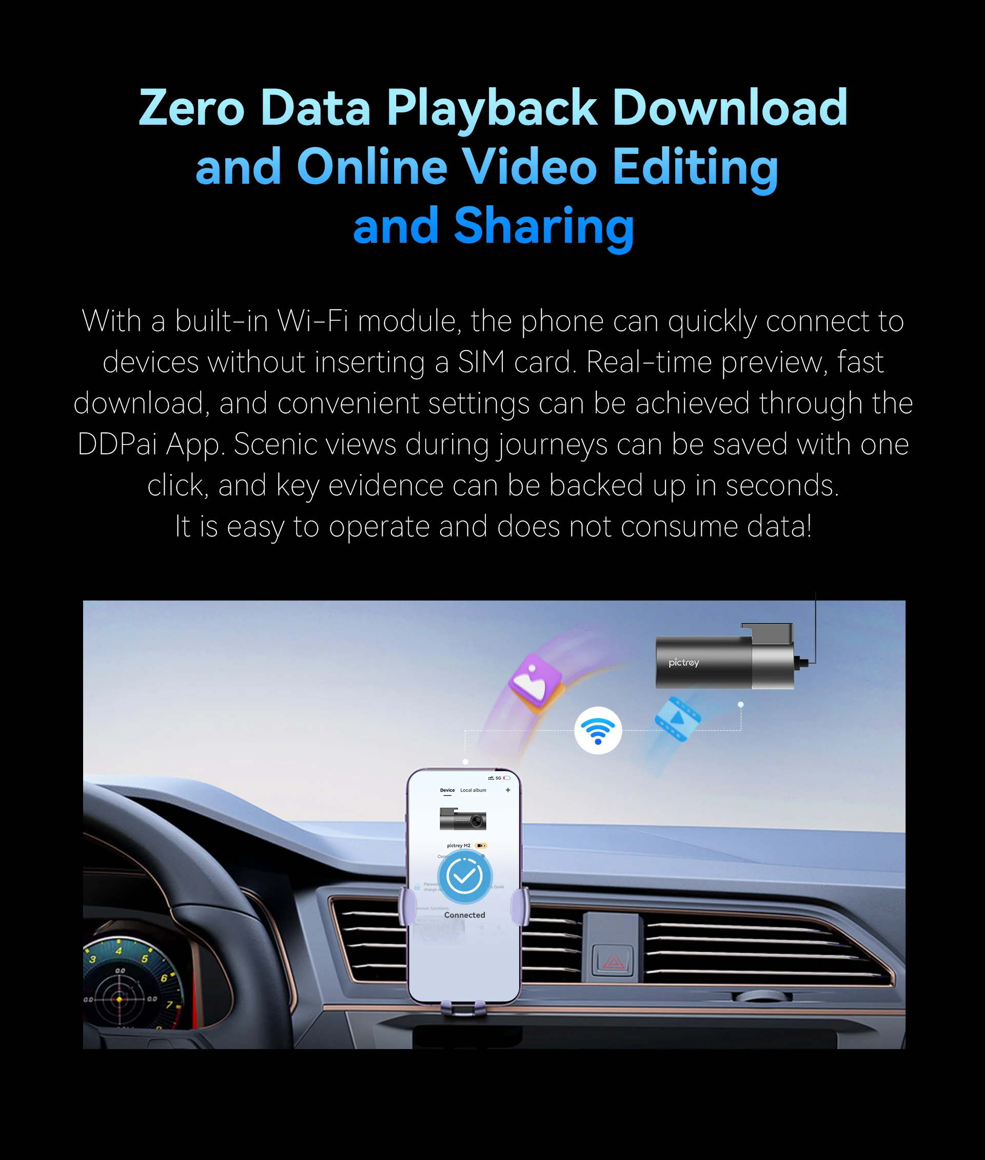 With a built-in Wi-Fi module, the phone can quickly connect to devices without inserting a SlM card. Real-time preview, fast download, and convenient settings can be achieved through the DDPai App. Scenic views during journeys can be saved with one click, and key evidence can be backed up in seconds. lt is easy to operate and does not consume data!
