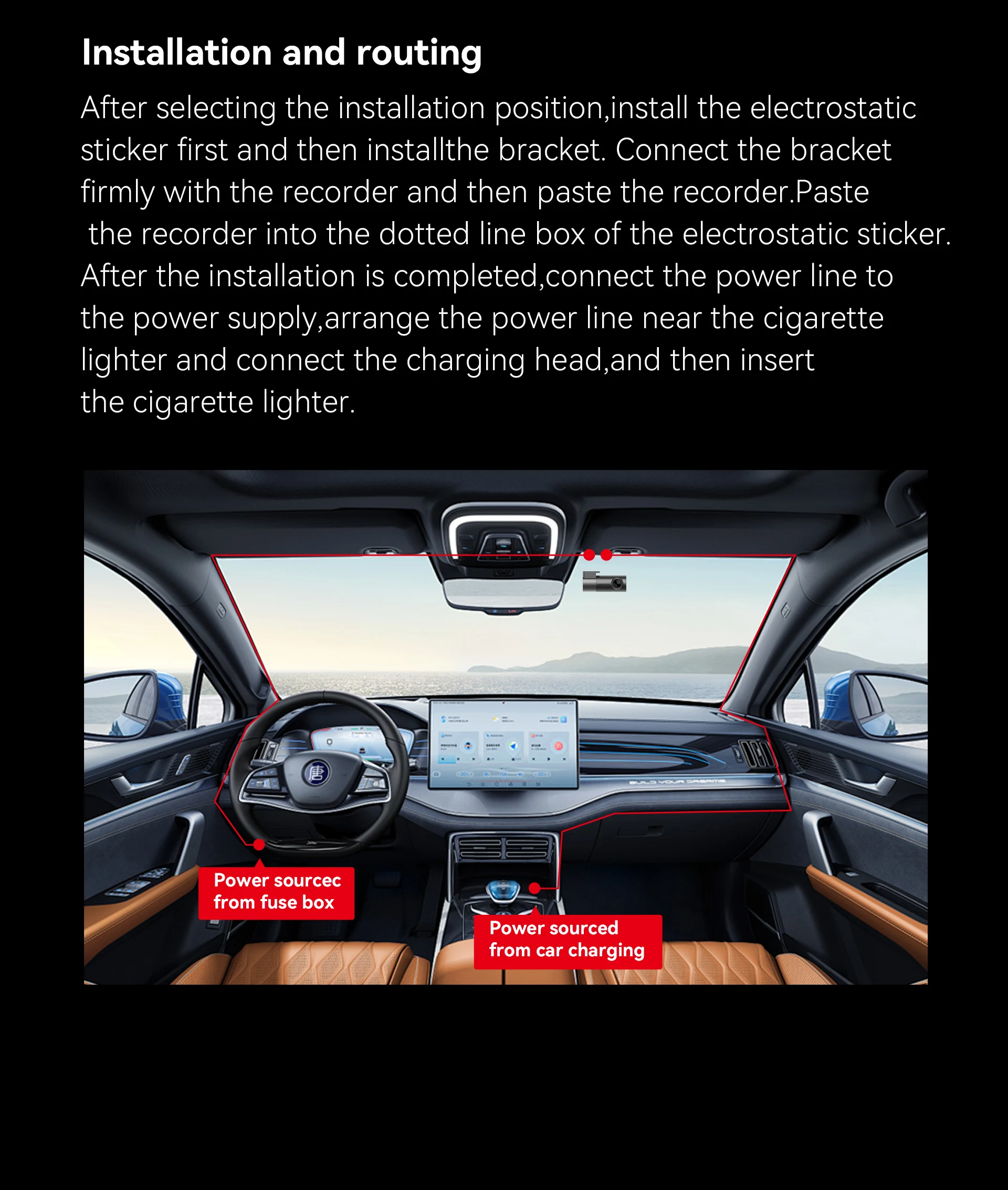 After selecting the installation position, install the electrostatic sticker first and then install the bracket. Connect the bracket firmly with the recorder and then paste the recorder. Paste the recorder into the dotted line box of the electrostatic sticker. After the installation is completed, connect the power line to the power supply, arrange the power line near the cigarette lighter and connect the charging head, and then insert the cigarette lighter.