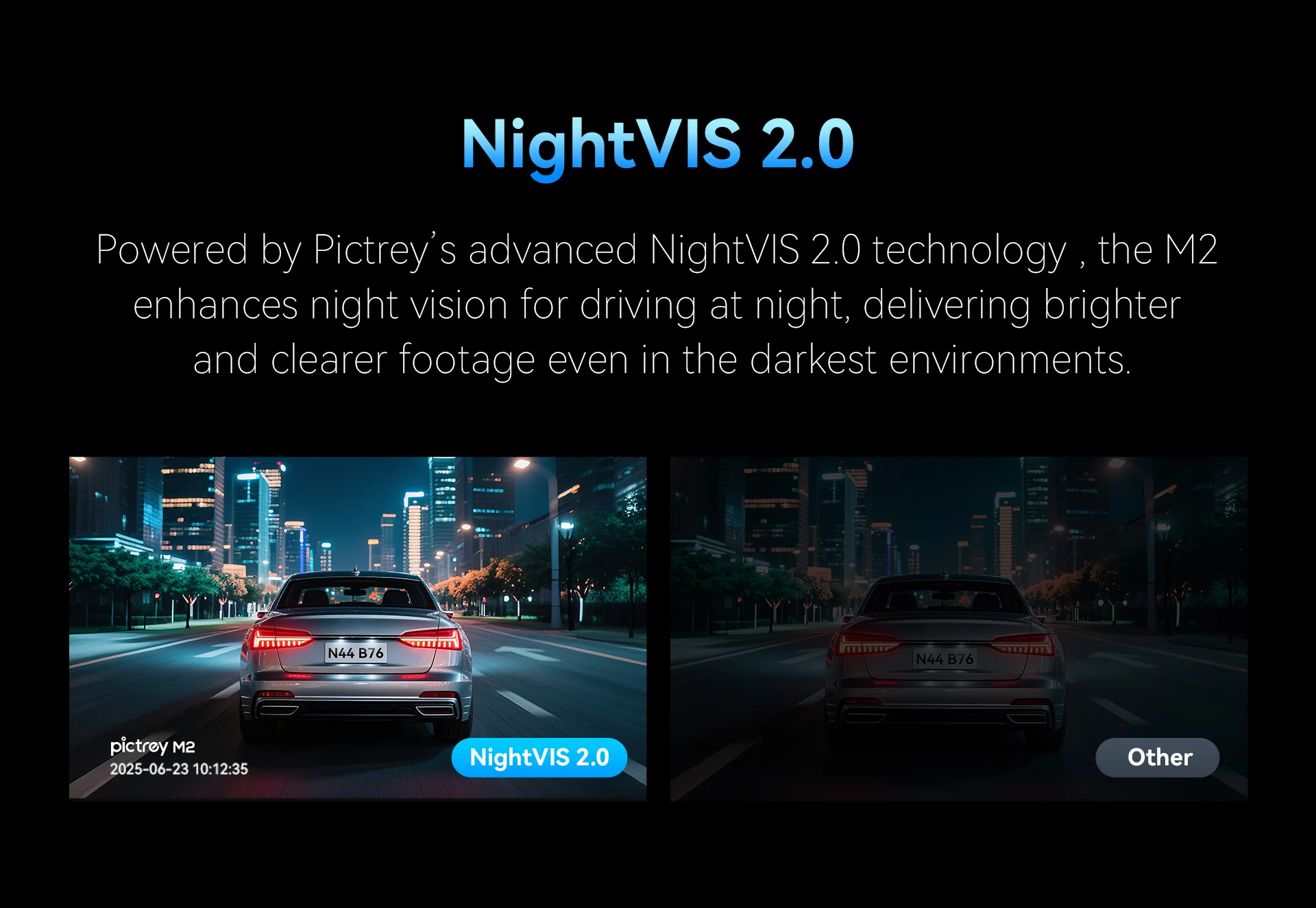 Powered by Pictrey's advanced NightVIS 2.0 technology , the M2 enhances night vision for driving at night, delivering brighter and clearer footage even in the darkest environments.