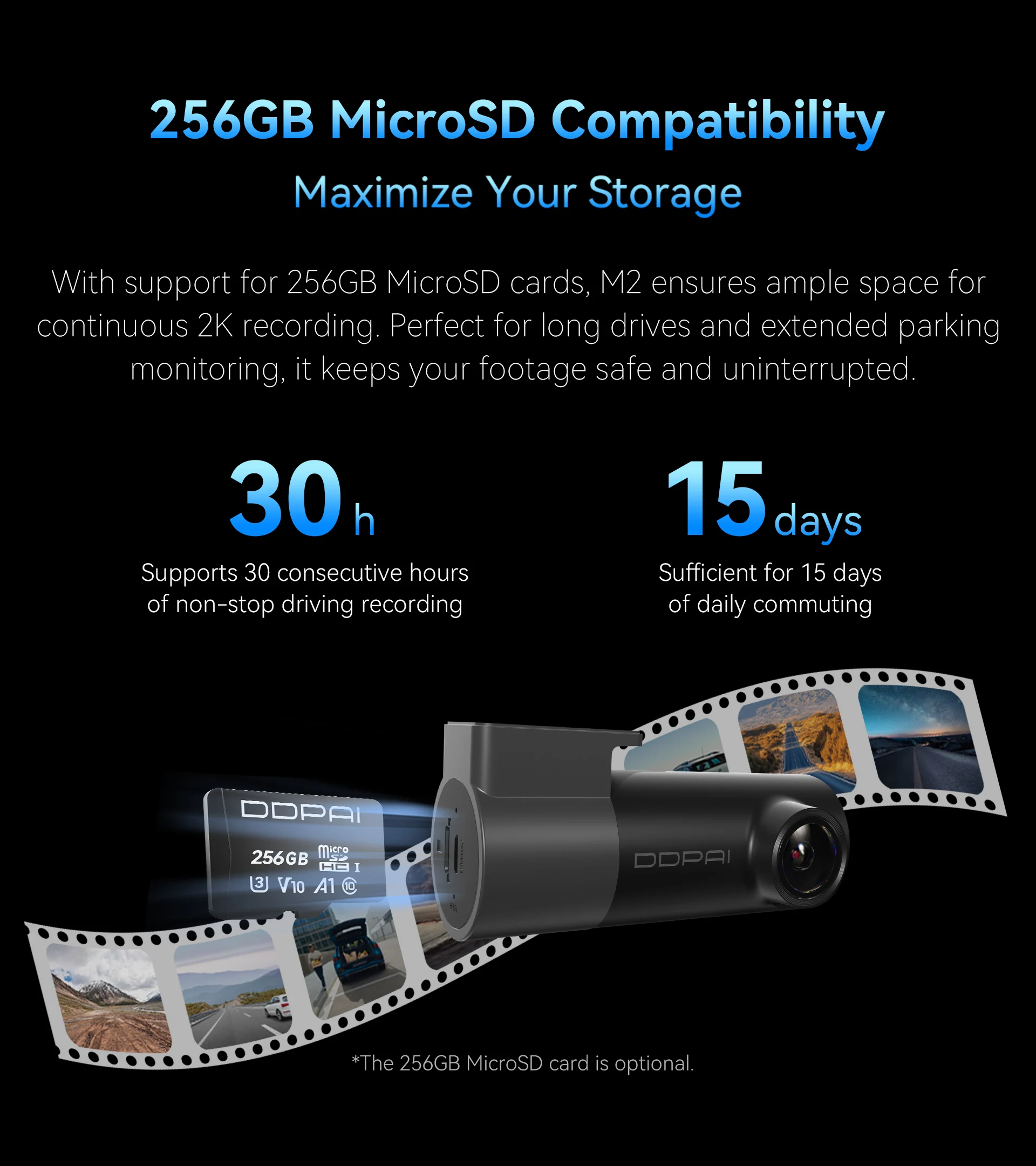 With support for 256GB MicroSD cards, M2 ensures ample space for continuous 2K recording, Perfect for long drives and extended parking monitoring, it keeps your footage safe and uninterrupted.