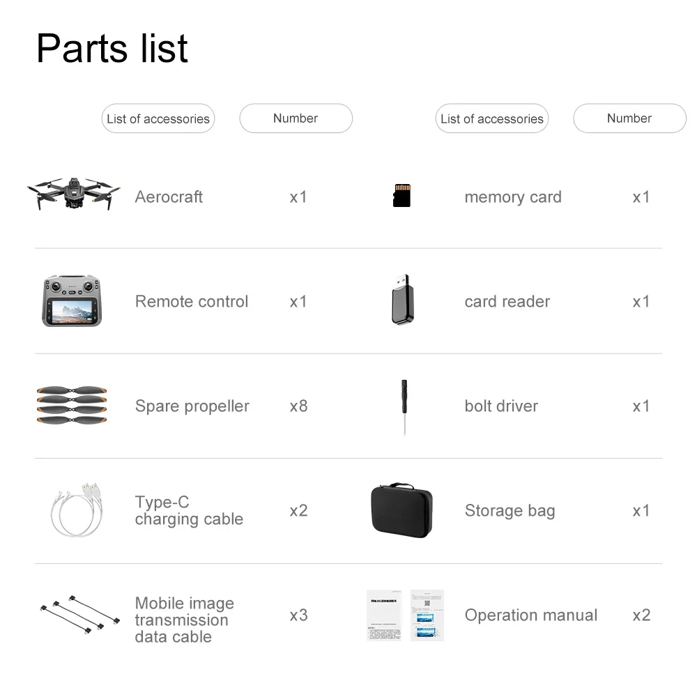 Aircraft * 1 with screen remote control transmitter * 1 high-speed 8GB memory card * 1 card reader * 1 body battery * 1 spare fan blade * 8 USB cable * 1 screwdriver * 1 manual * 1 built-in high-definition camera * 1 WIFI manual * 2
