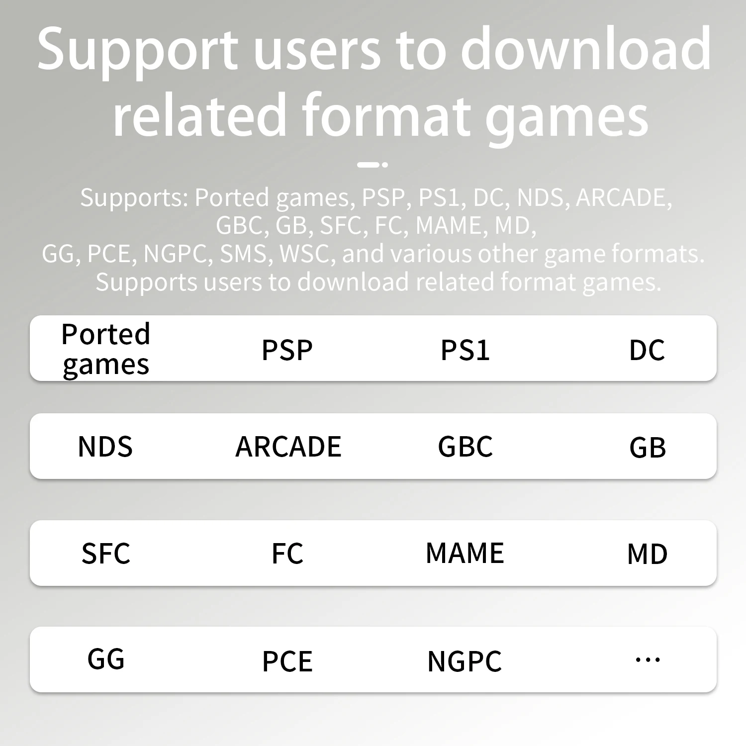 Supports Ported games etc more than 10 game simulators format. Supports users to download related format games.With its 64G,128G,256G storage capacity, you can enjoy a vast library of games, and there's an option to insert an additional TF card to expand your game collection even further, maximum 512GB.