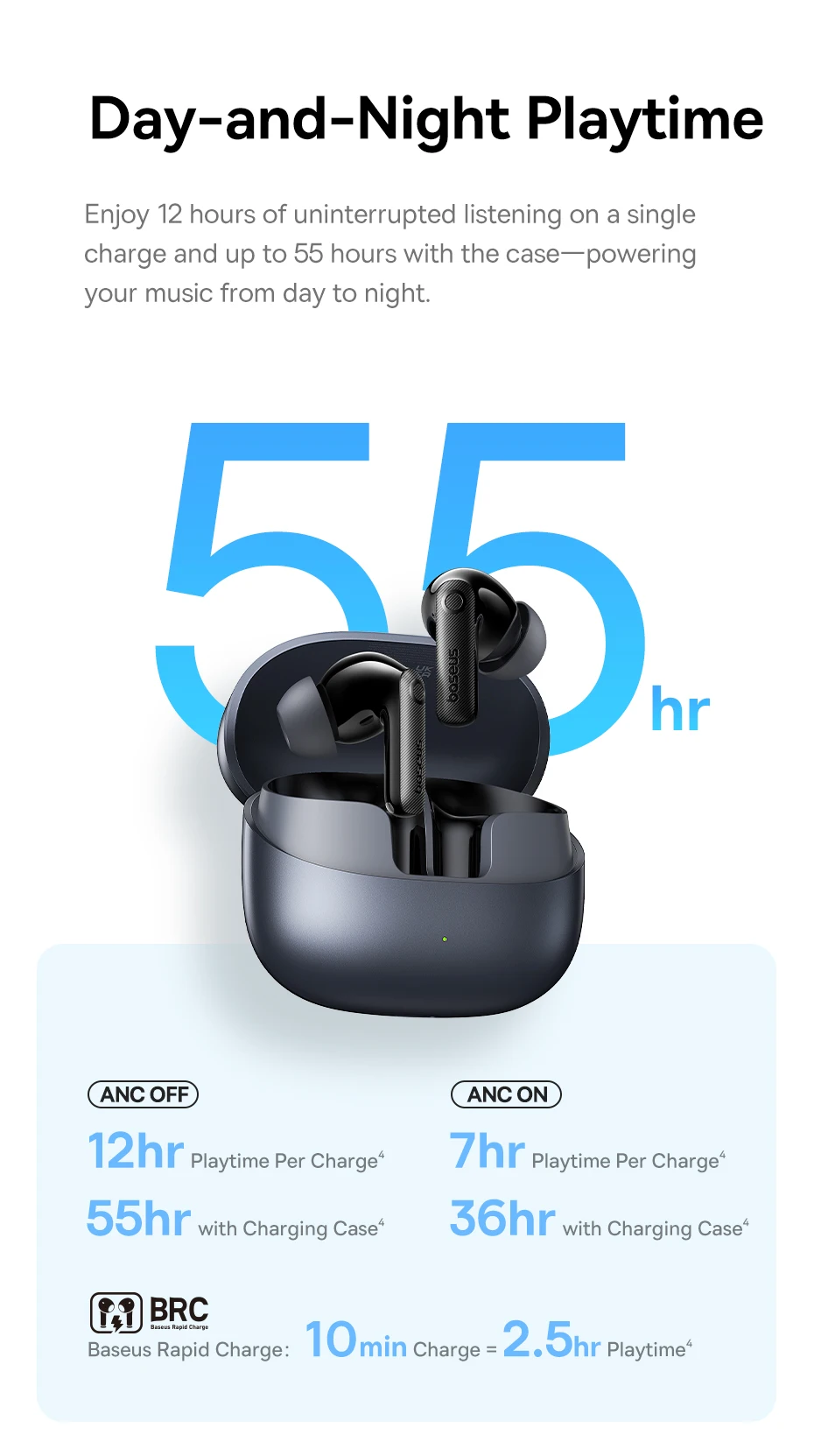 Enjoy up to 12 hours of playtime on a single charge and 55 hours with the case (ANC off),or 7 hours per charge and 36 hours total (ANC on). A quick 10-minute Basous Rapid Chargo (BRC) gives you 2.5 more hours of music- perfect when you're in a rush.