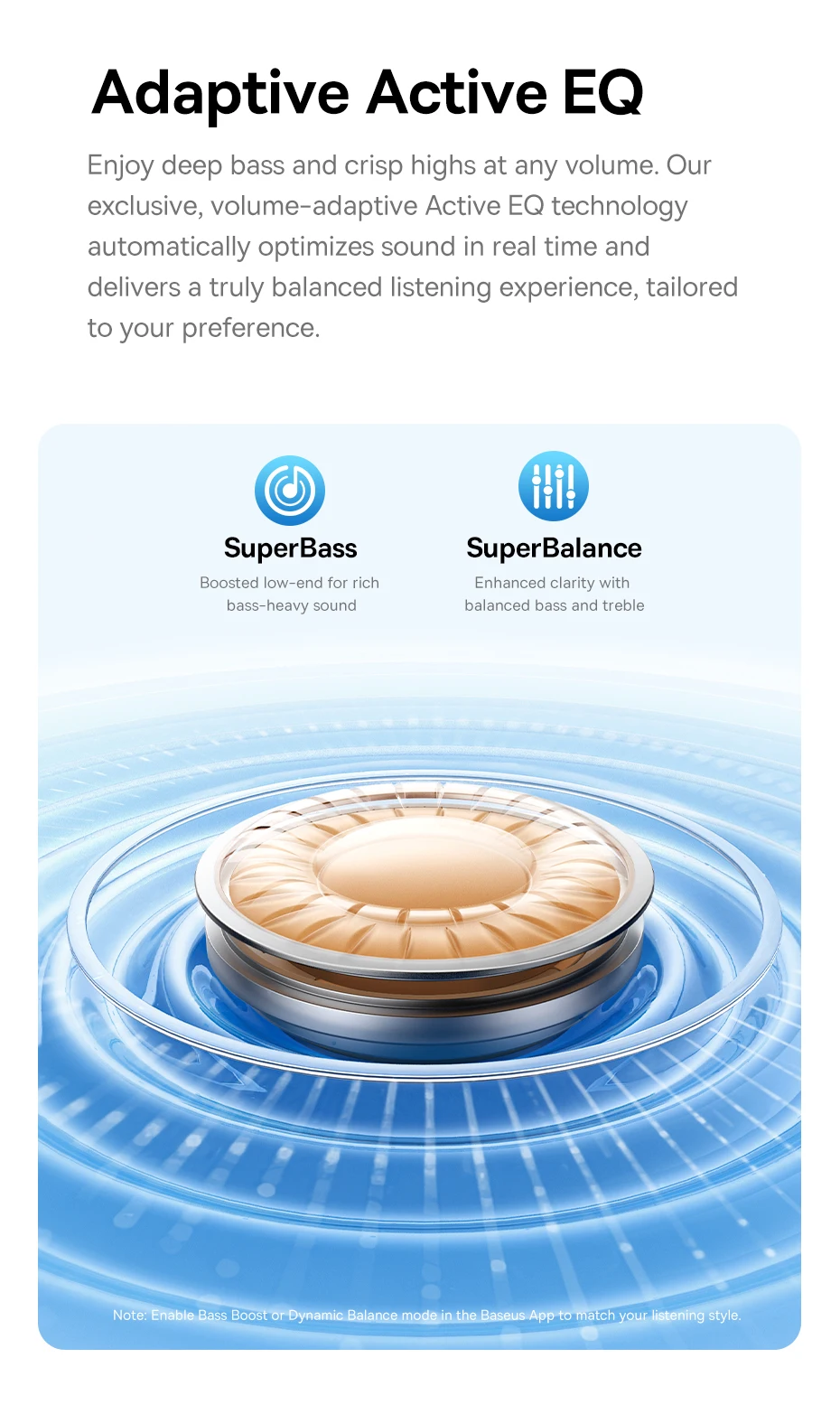 Enjoy deep bass and crisp highs at any volume. Our exclusive, volume-adaptive Active EQ technology automatically optimizes sound in real time and delivers a truly balanced listening experience,tailored to your preference.