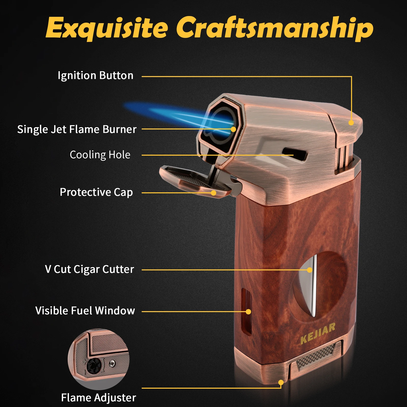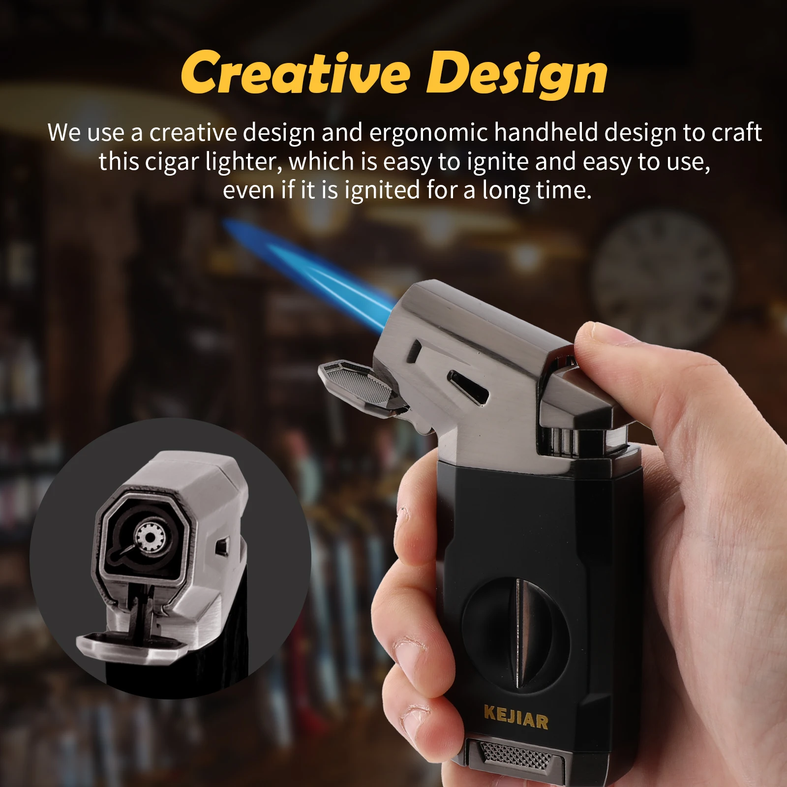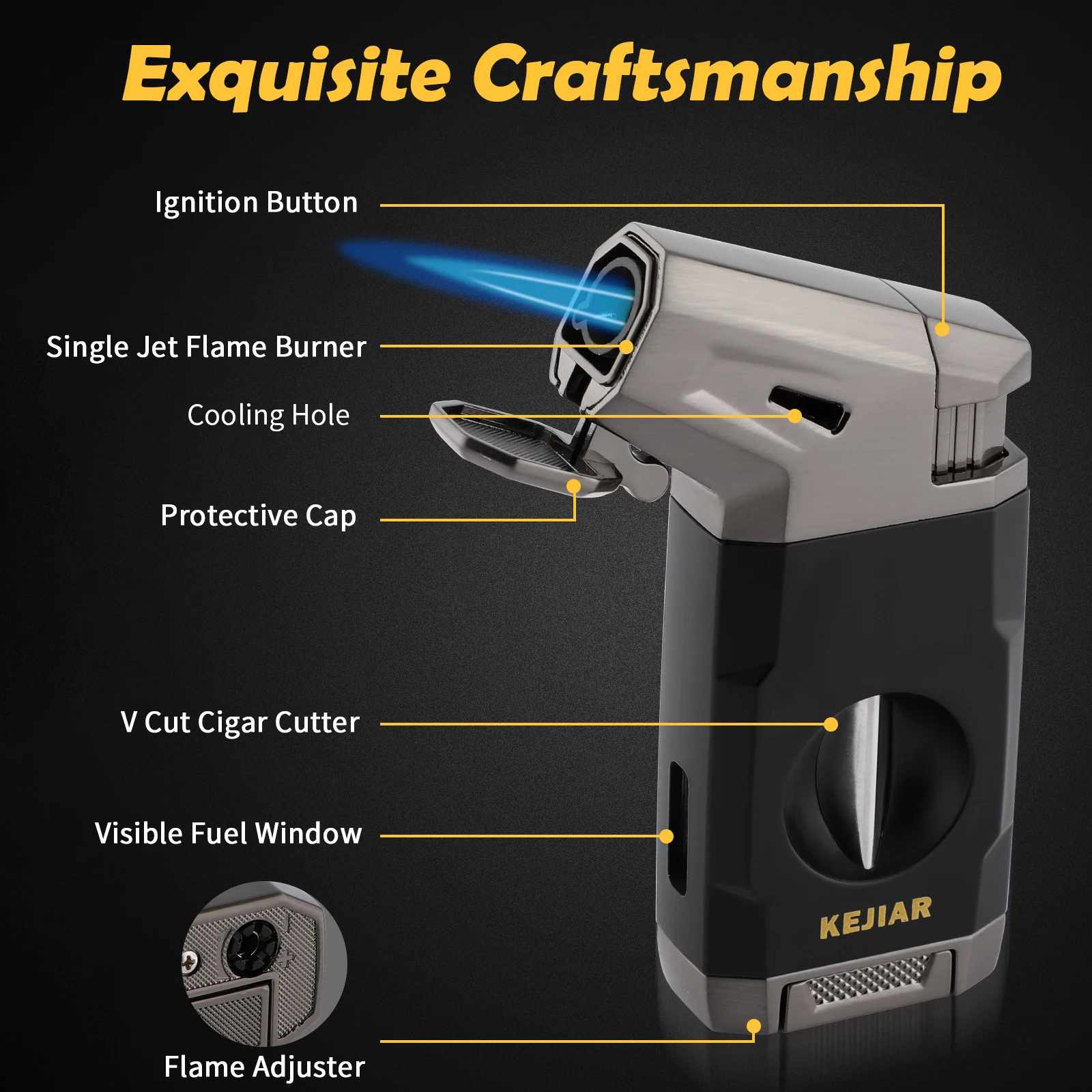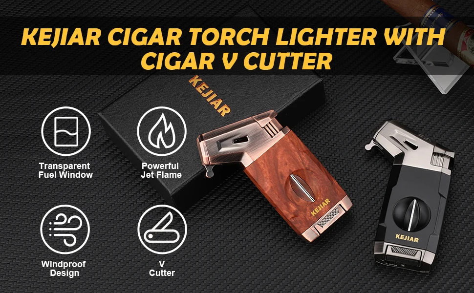 Powerful Jet Flame: KEJIAR butane lighter is made of ZINC ALLOY and PLASTIC materials,sturdy and durable.With stylish design and very textured in the hand,this cigar lighter features a LARGE IGNITION NOZZLE,emits a powerful WINDPROOF jet flame,allowing you to quickly ignite your cigar in few seconds.The flame adjuster at the bottom makes you to control the flame intensity as needed.Even in windy conditions, you can trust it to light up,it is the perfect companion for outdoor use[WITHOUT BUTANE]