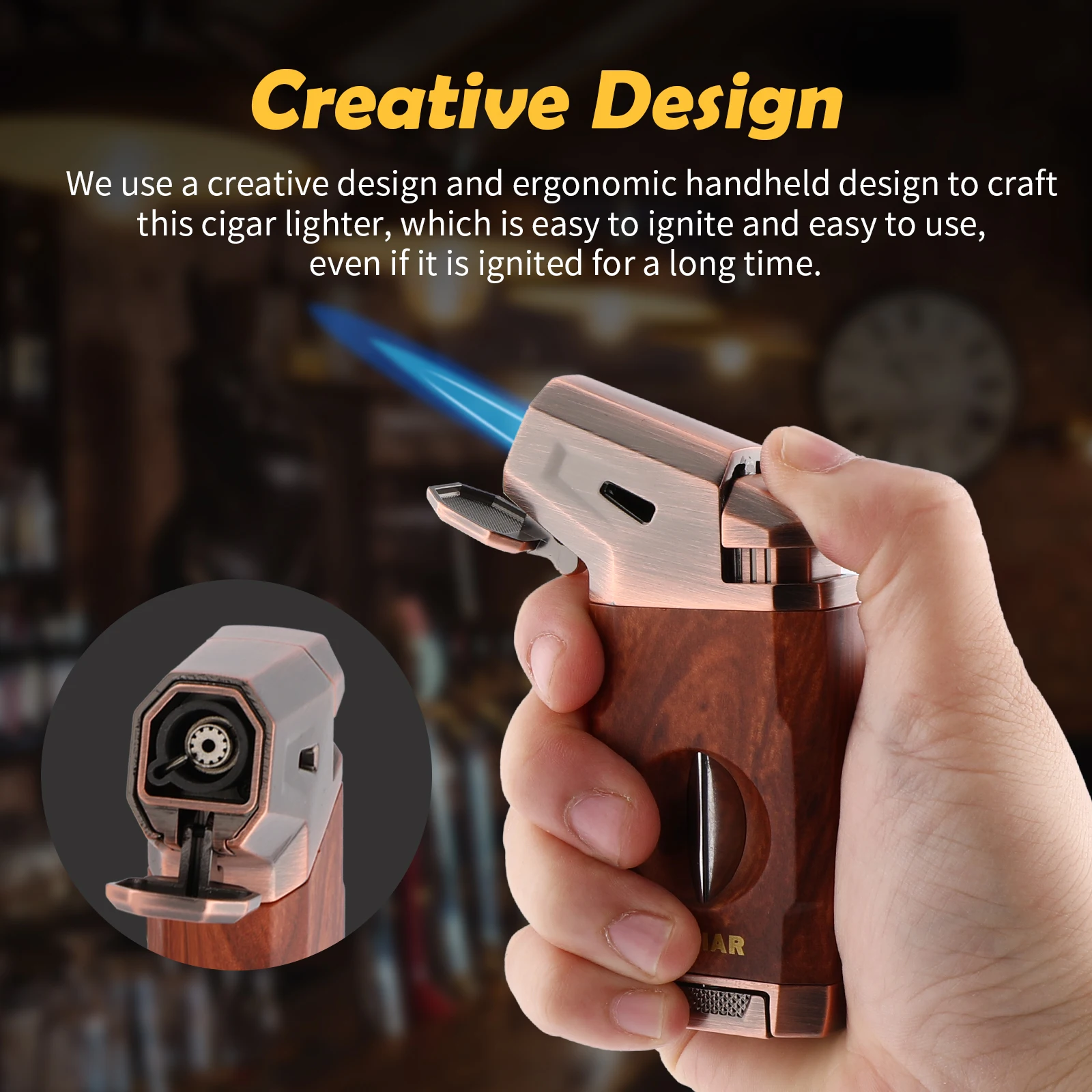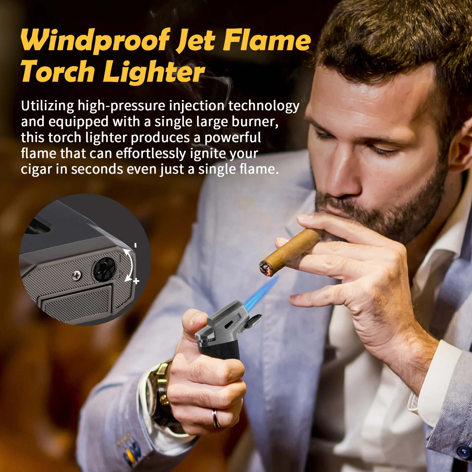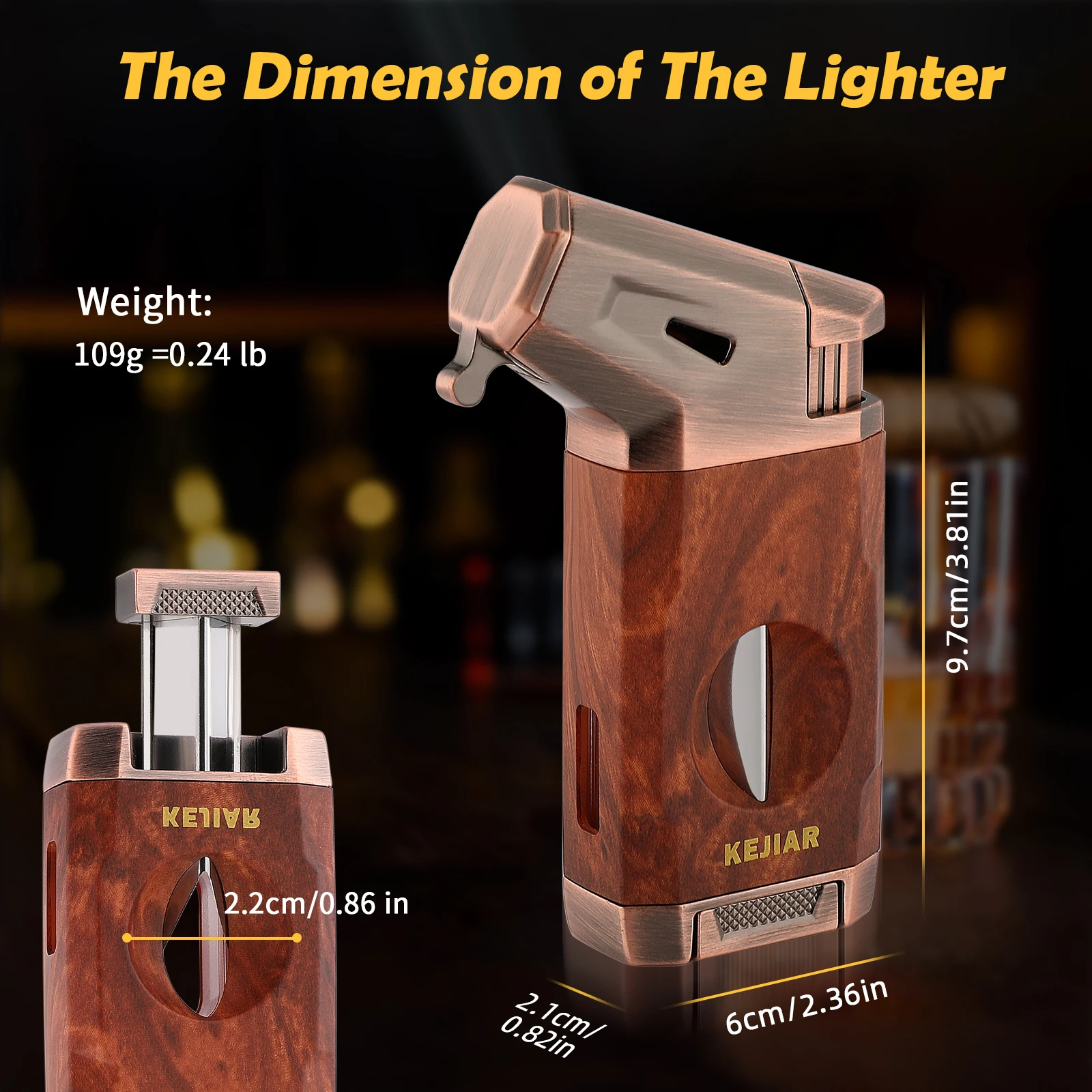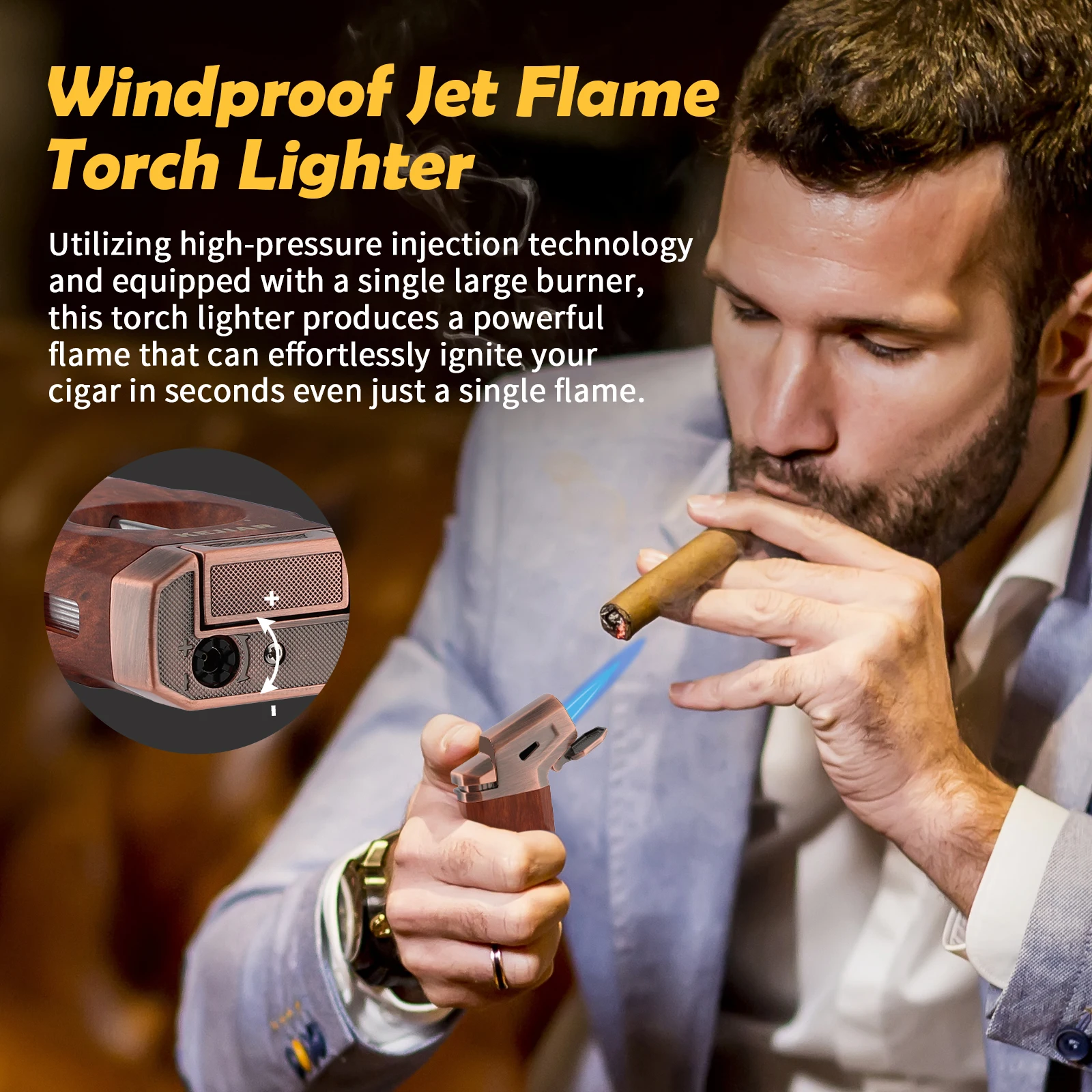 Powerful Jet Flame: KEJIAR butane lighter is made of ZINC ALLOY and PLASTIC materials,sturdy and durable.With stylish design and very textured in the hand,this cigar lighter features a LARGE IGNITION NOZZLE,emits a powerful WINDPROOF jet flame,allowing you to quickly ignite your cigar in few seconds.The flame adjuster at the bottom makes you to control the flame intensity as needed.Even in windy conditions, you can trust it to light up,it is the perfect companion for outdoor use[WITHOUT BUTANE]