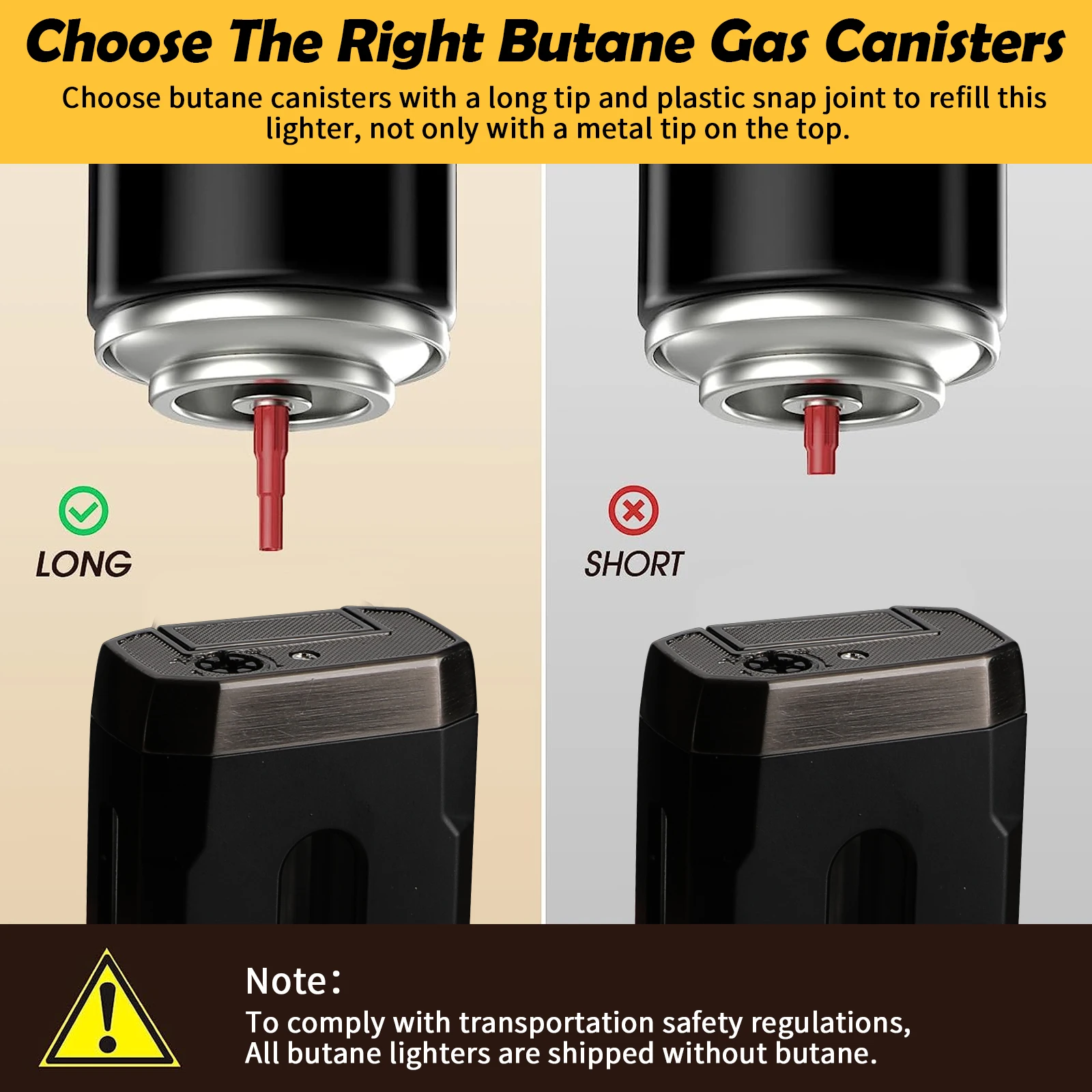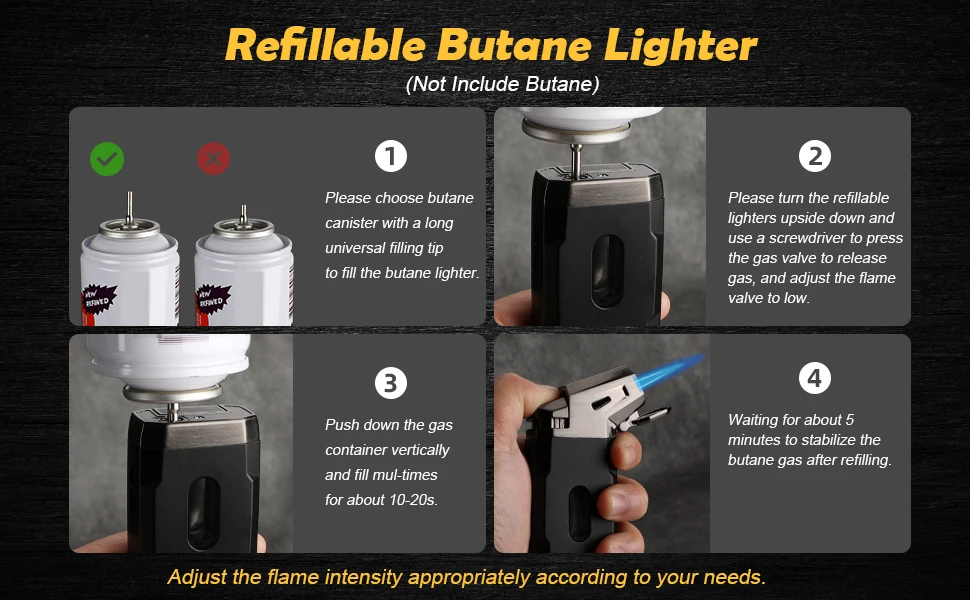How to Refill The Butane Gas: 1.Choose butane canisters with a LONG TIP and PLASTIC SNAP JOINT to refill this lighter, not only with a metal tip on the top. Otherwise, the filling is EASY TO LEAK 2. Adjust the flame button to middle setting before refilling. 3.Insert the nozzle into the hole vertically. Make sure that depress the refilling hole down 4.Fill multiple times about 10s each time. 5.Waiting for about 5 min to stabilize the butane gas