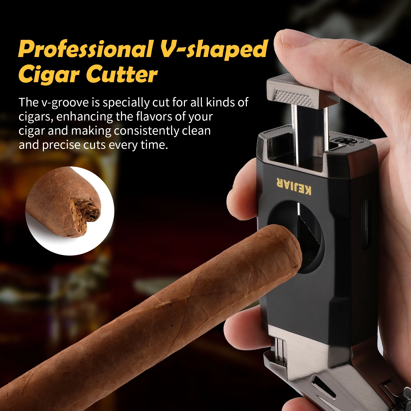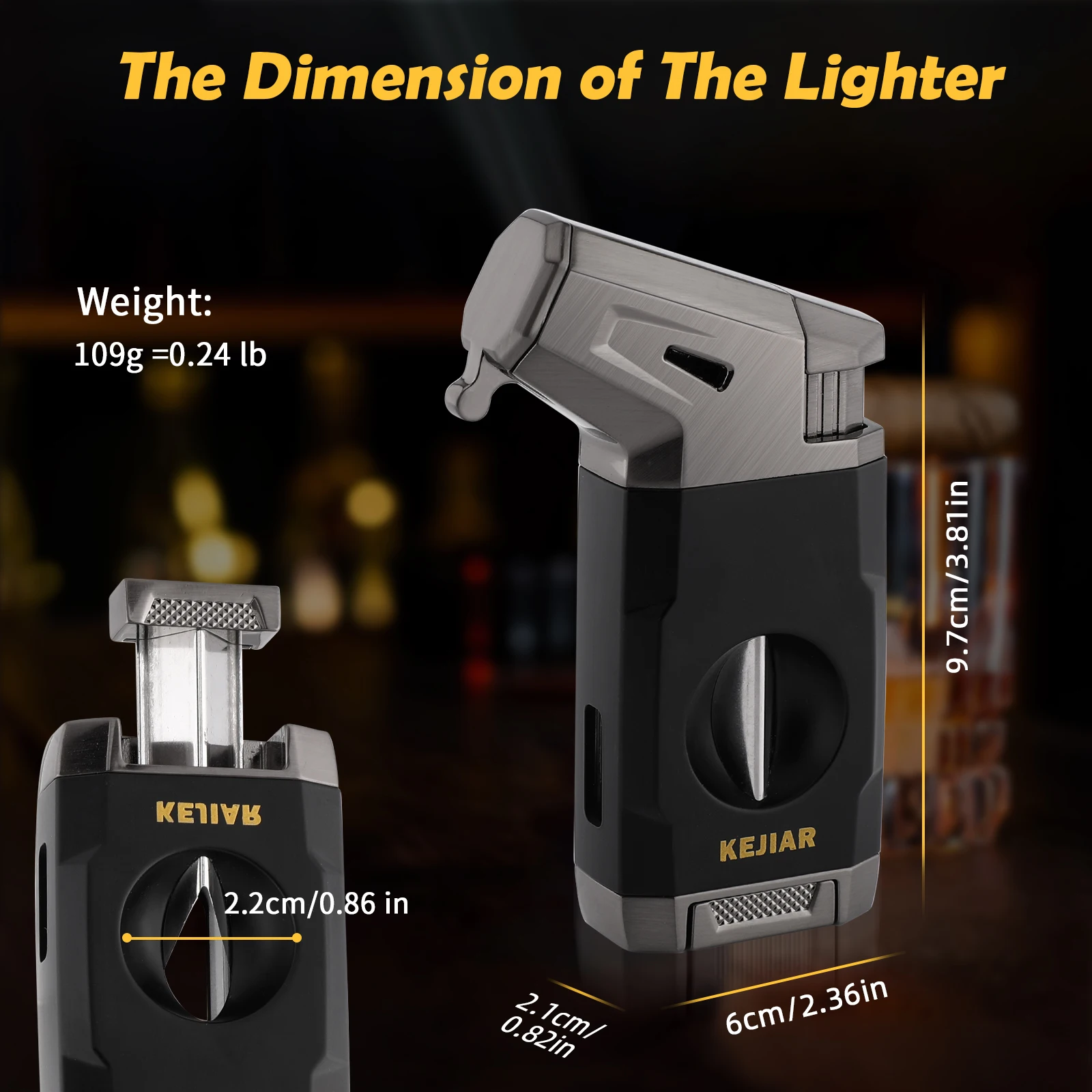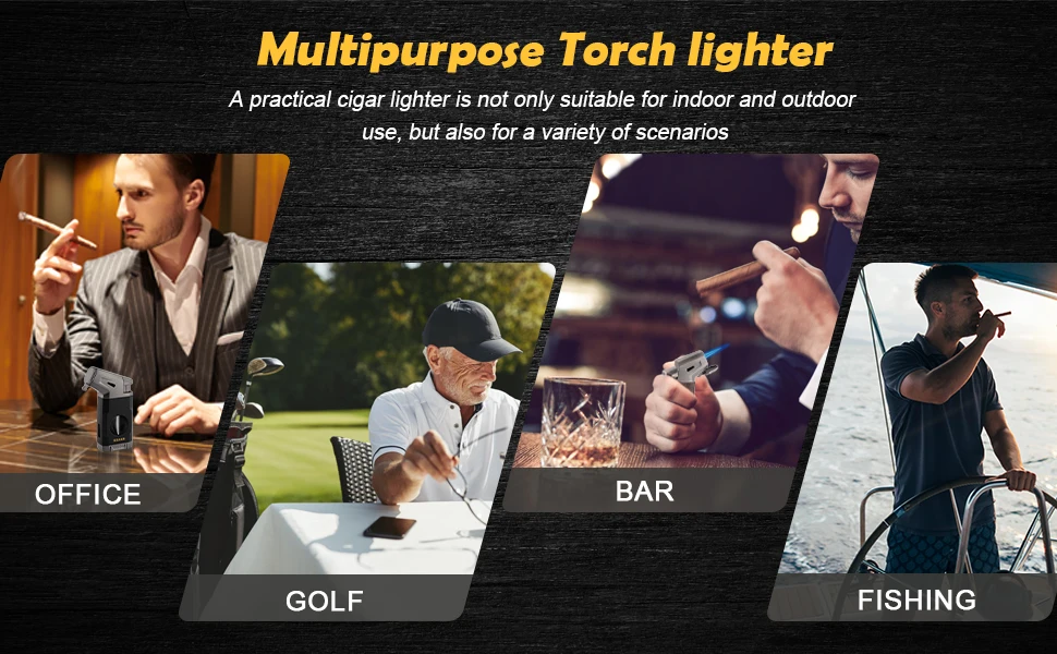 Multifunctional Cigar Lighter with V Cutter: The cigar lighter boasts a built-in V CUT CIGAR CUTTER,fits most types of cigars.Made of STAINLESS STEEL,the blades is ultra-sharp,hard,and resistant to rust.This sharp blades guarantee a smooth and clean cut,enhancing your smoking experience.With a diameter of 0.86 in,it can effortlessly cut cigars up to 56 ring gauge.this cigar cutter and lighter set offers convenience for you,so you don't need to carry additional accessories when you're on the go.
