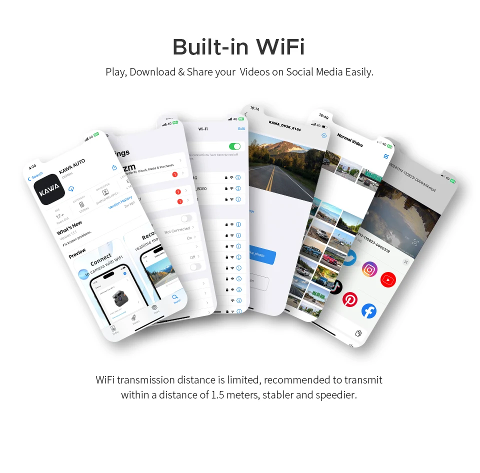 The dashcam features built-in WiFi that connect phone to the dashcam without cables, transferring videos and adjusting settings quick and hassle-free. No need to remove the SD card for viewing footage.