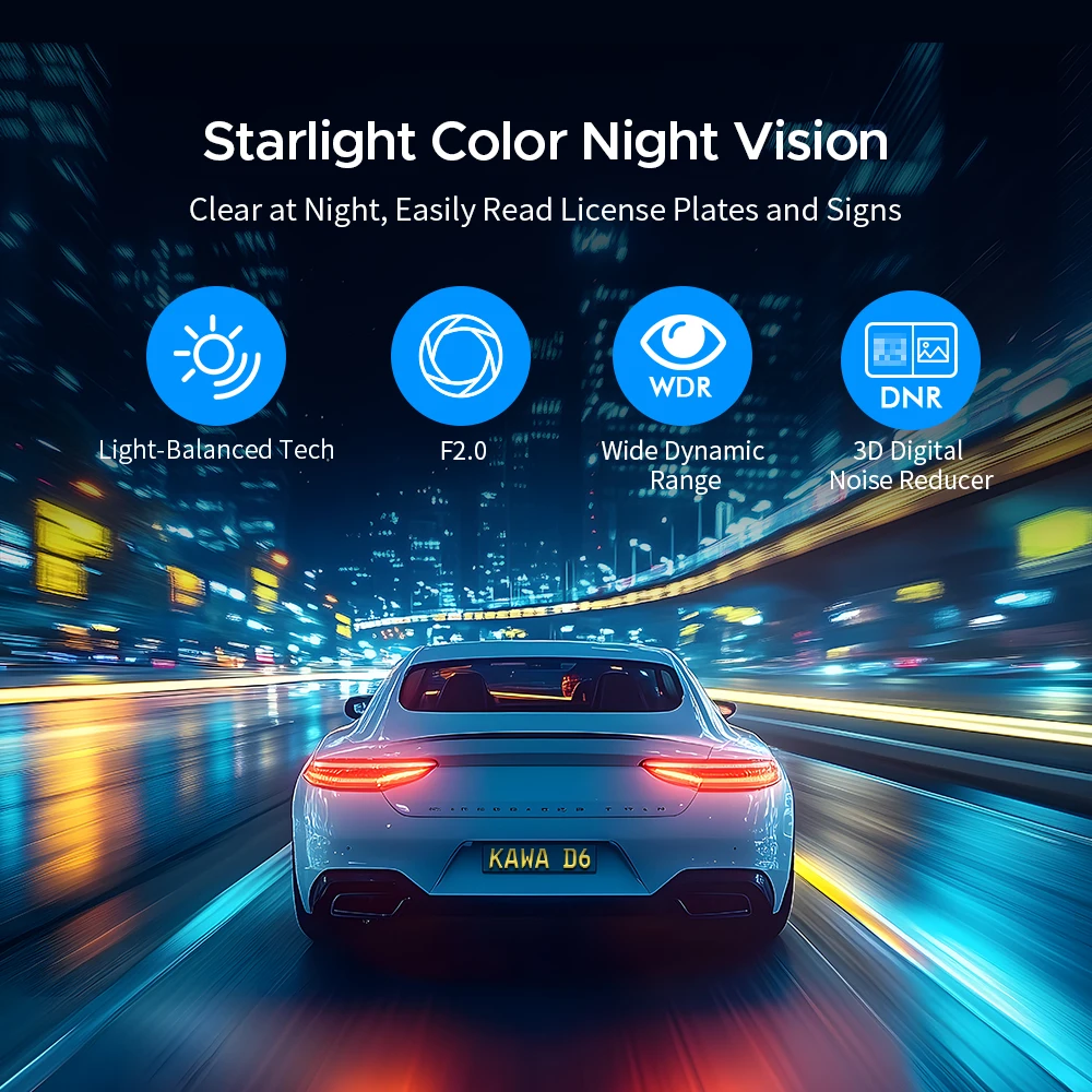 NightEagle™ Engine: a night vision processing technology developed by KAWA, enhances critical details like license plates in low-light conditions, help to capture clearer footage at night—drive with greater peace of mind.