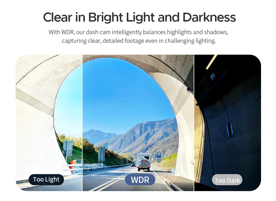 With Wide Dynamic Range (WDR) technology, your dashcam can capture balanced images in both bright sunlight and low-light environments. This feature helps to bring out important details hidden in shadows or highlights, making your videos clearer and more useful for identifying objects or license plates.