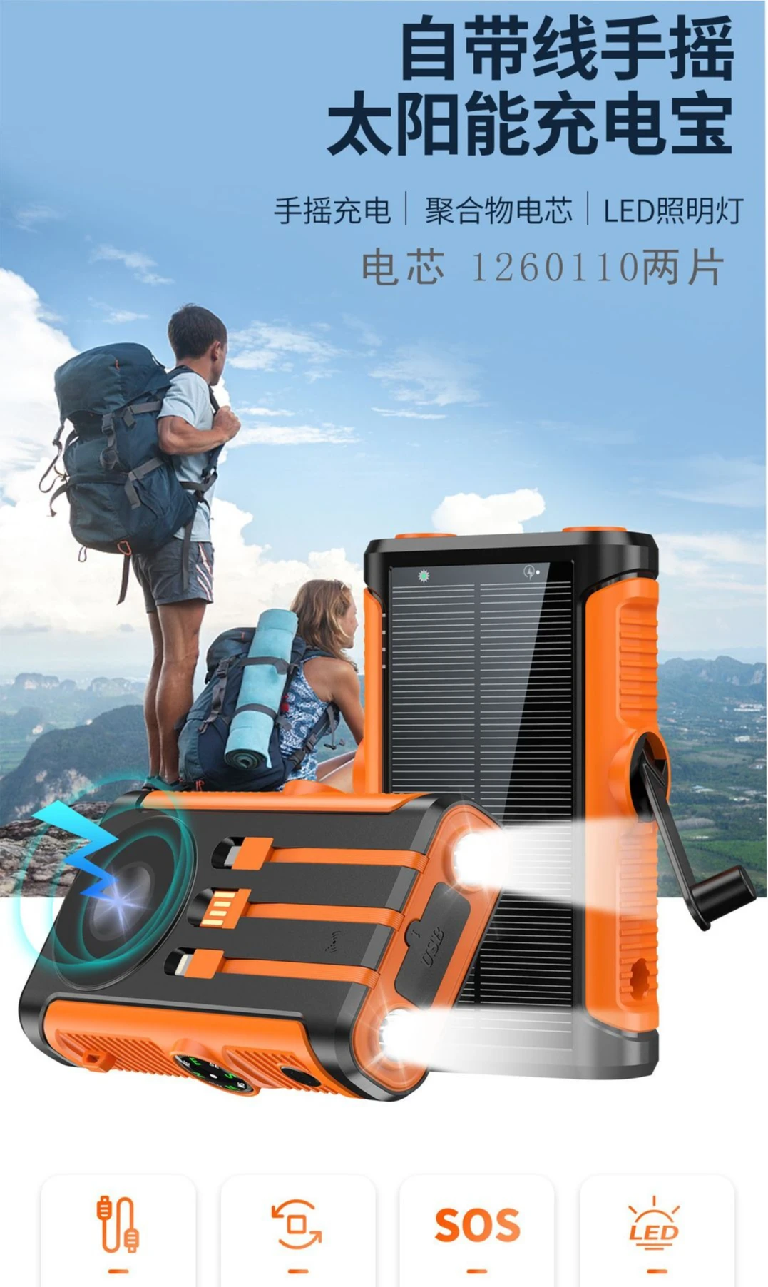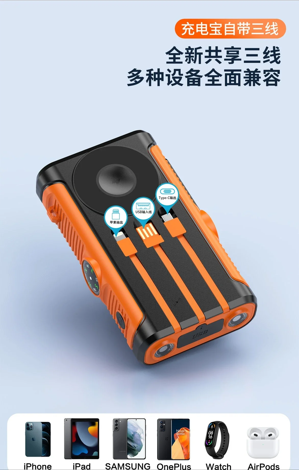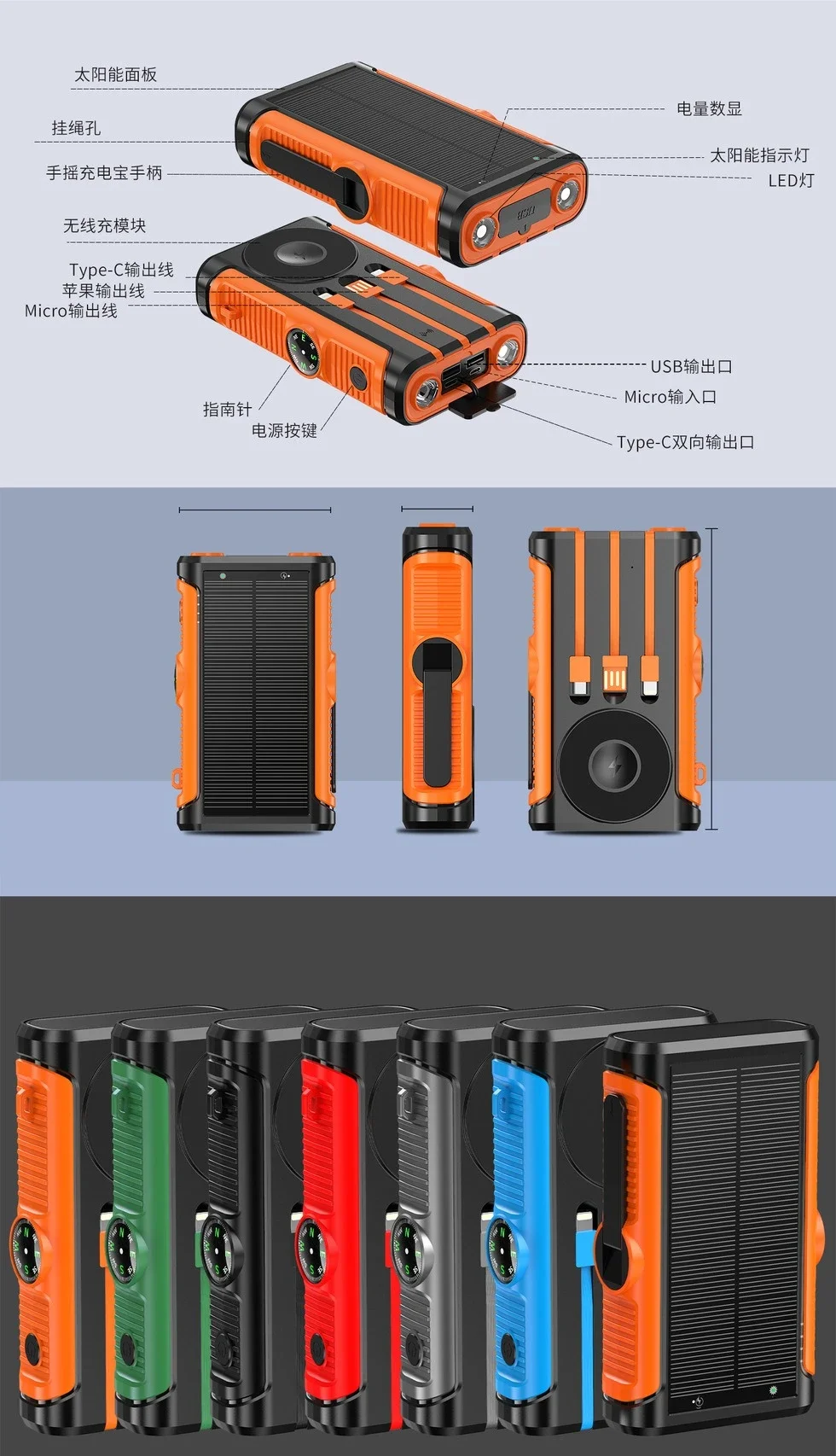 Features: Wireless Charge,With Solar Panel,With Flashlight,Built in Cables