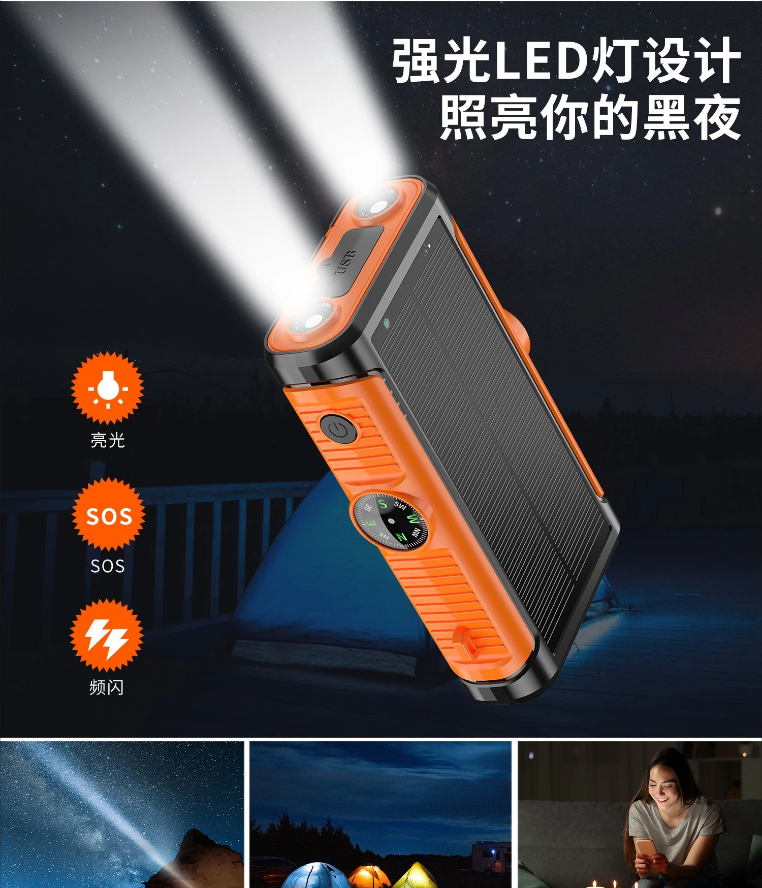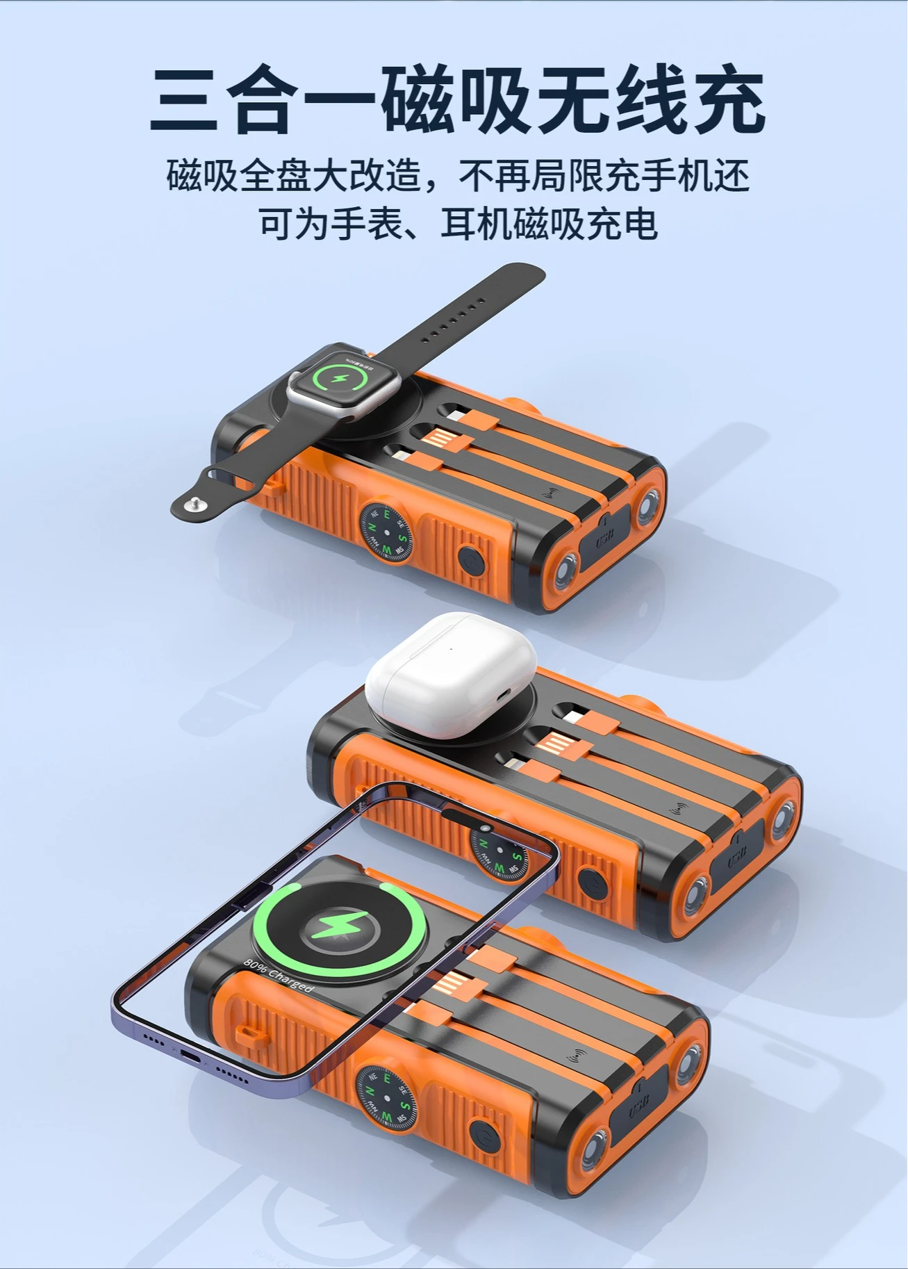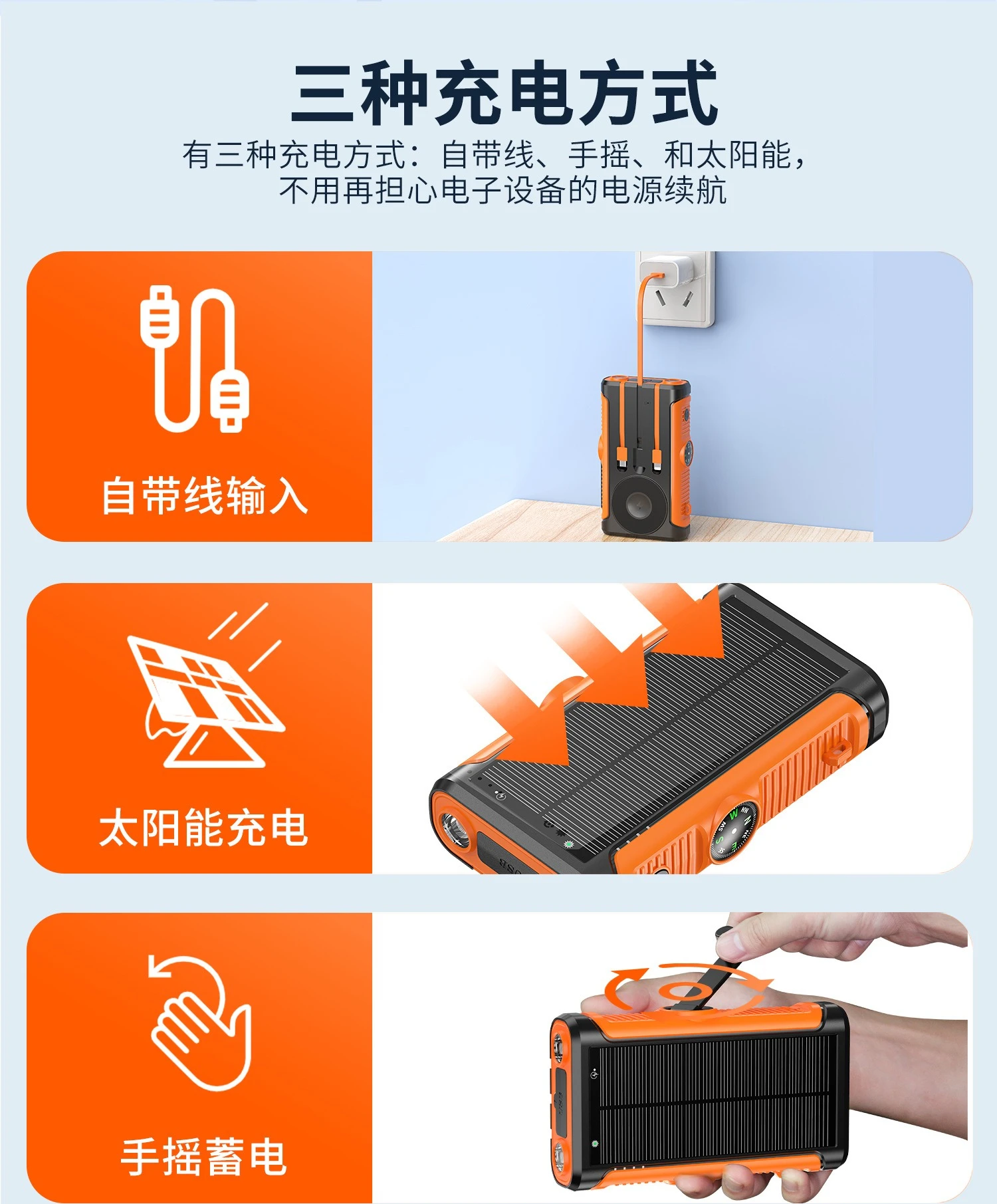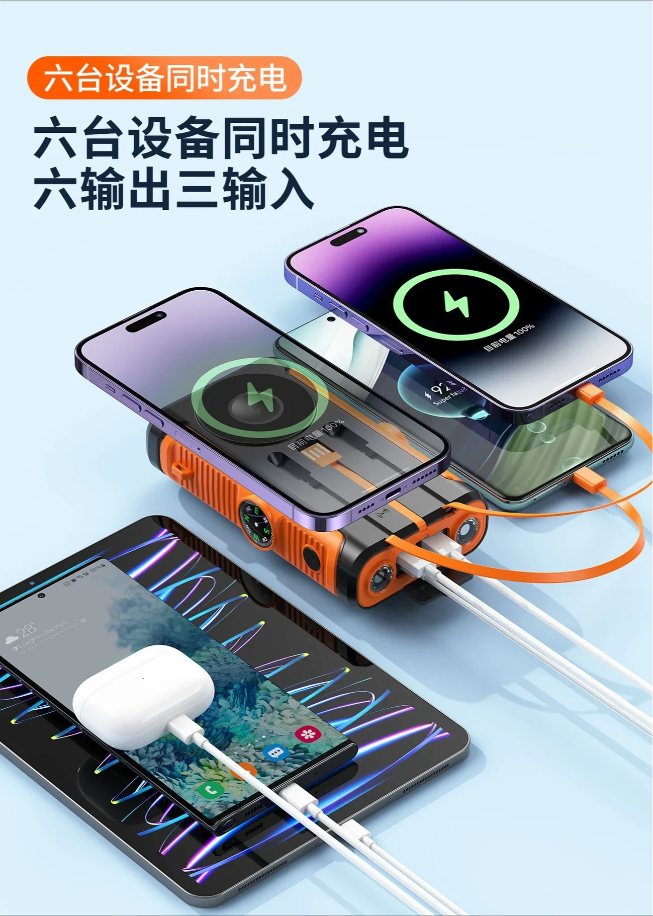Features: Wireless Charge,With Solar Panel,With Flashlight,Built in Cables