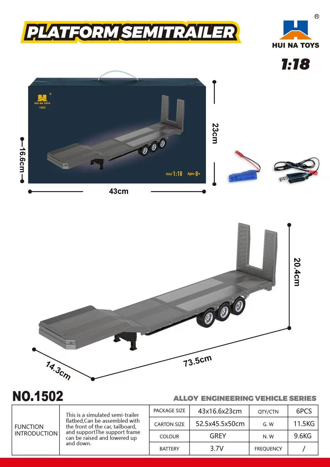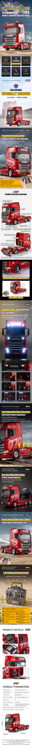 Product Features: Forward/Backward/Left/Right/Drag Hook Open/Drag Hook Close/Servo Left/Servo Right/Support Frame Up/Support Frame Down/Tailboard Up/Tailboard Down/Sound On/Sound Off/Front and Rear Lights On/Auxiliary Lights On/Roof Lights On/Panel Lights On/All Lights Off