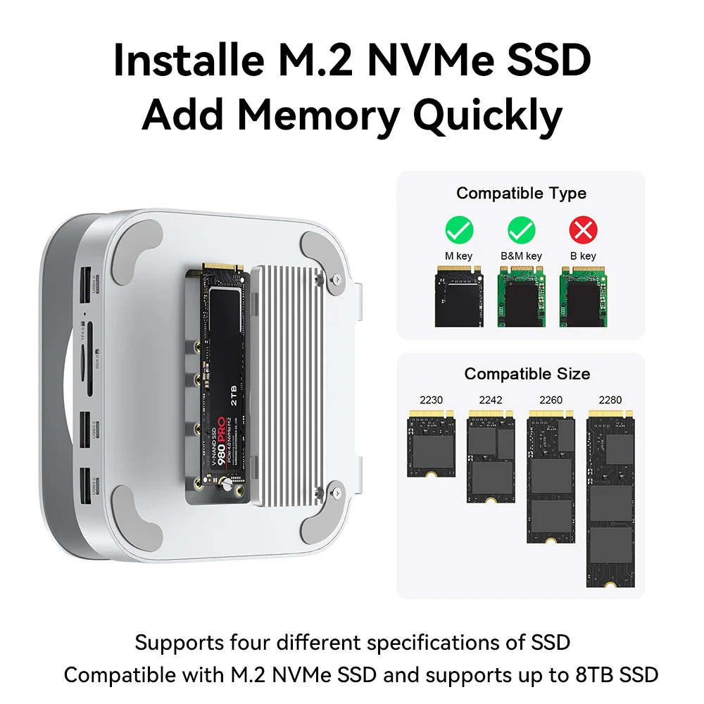 Mac Mini M4/M4 Pro Dock with M.2 NVMe SSD enclosure, 10Gbps USB3.2 Gen2 *2, 480Mbps USB2.0 *1, SD4.0/Micro SD4.0 card slot and 5V/2A power supply ports. Various interfaces meet all your needs