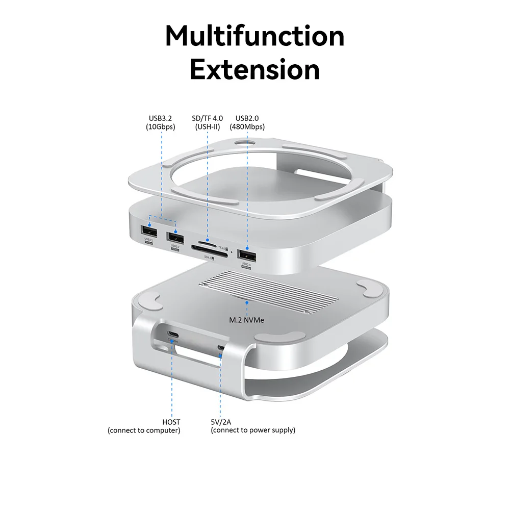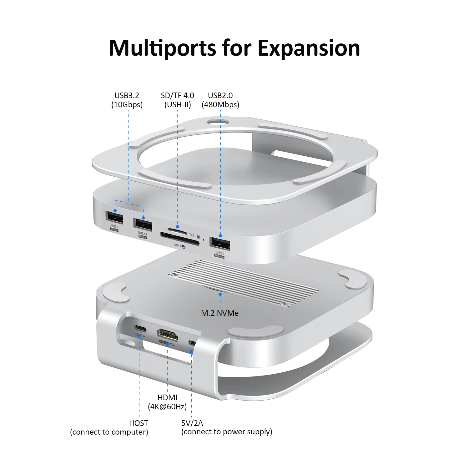 Mac Mini M4/M4 Pro Dock with M.2 NVMe SSD enclosure, 10Gbps USB3.2 Gen2 *2, 480Mbps USB2.0 *1, SD4.0/Micro SD4.0 card slot and 5V/2A power supply ports. Various interfaces meet all your needs