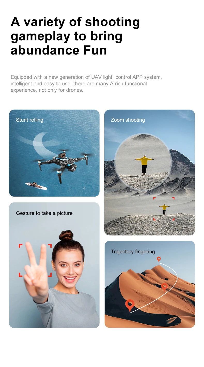 Advanced functions :1. Built-in display 2. Accurate positioning one-key return, low-power return, lost contact return 3. 4.MV recording sharing, gesture photography, gesture video, double camera switching beautiful body 5.ABS high toughness case, super resistance to fall 6. Omnidirectional LED lighting