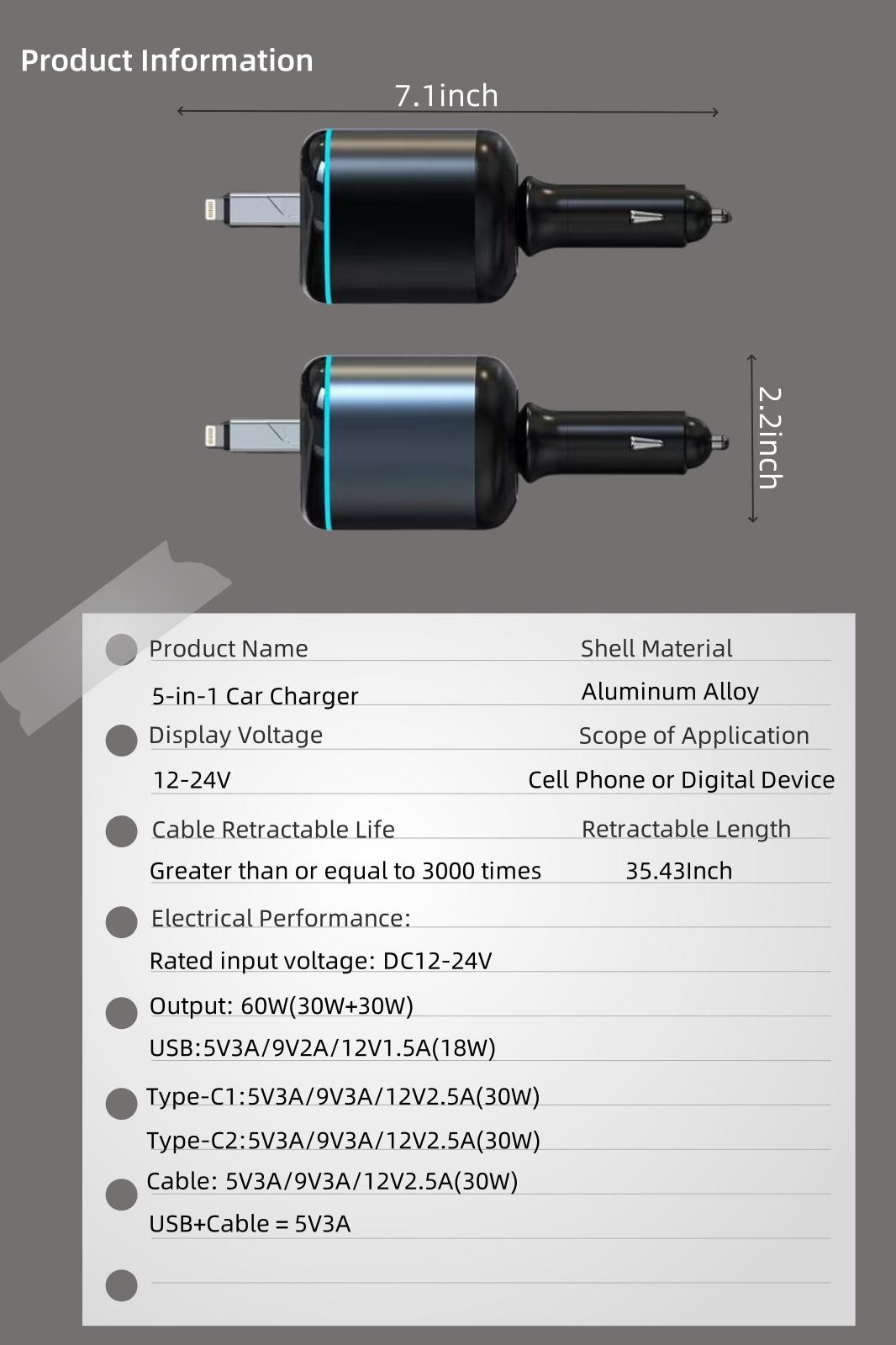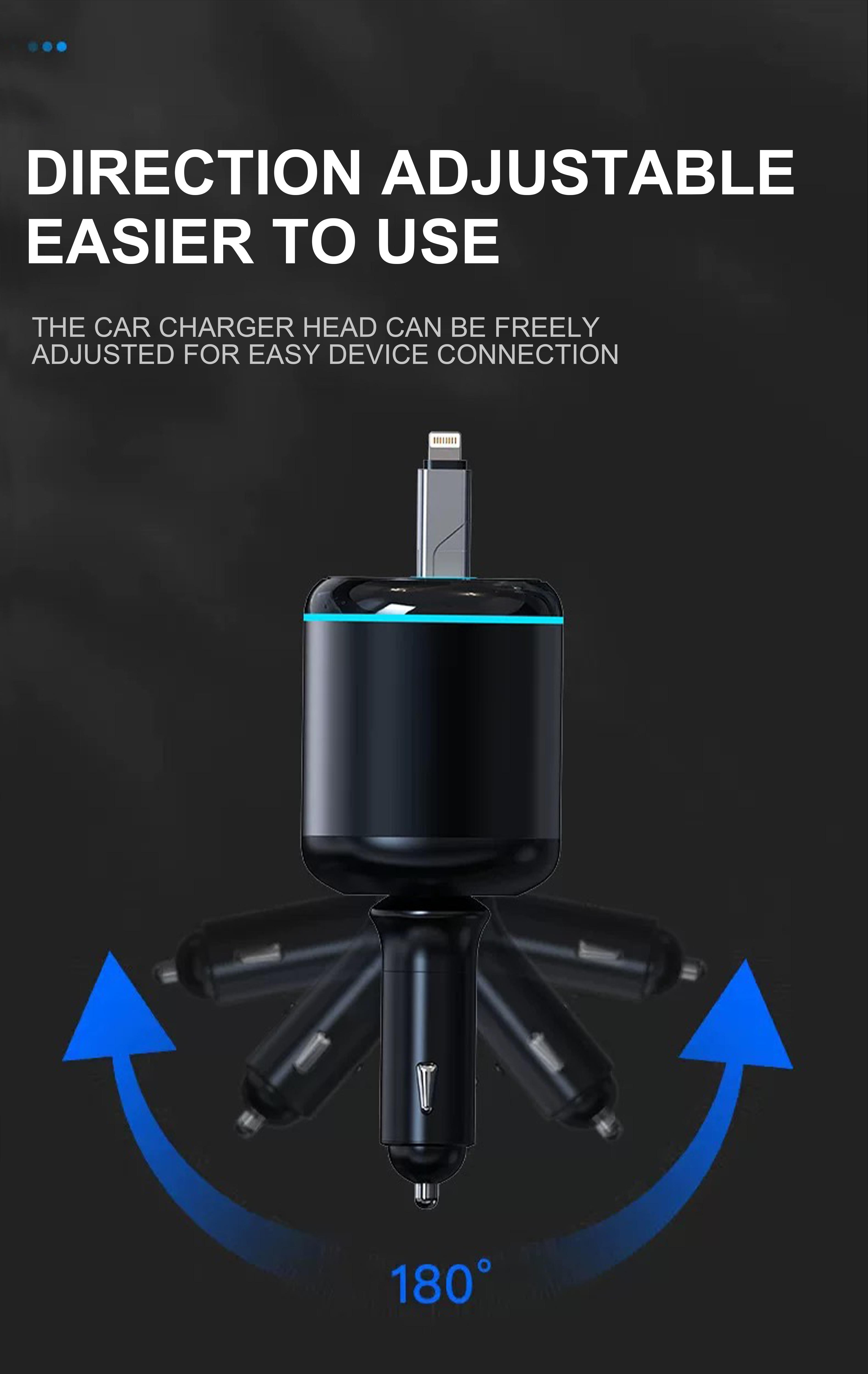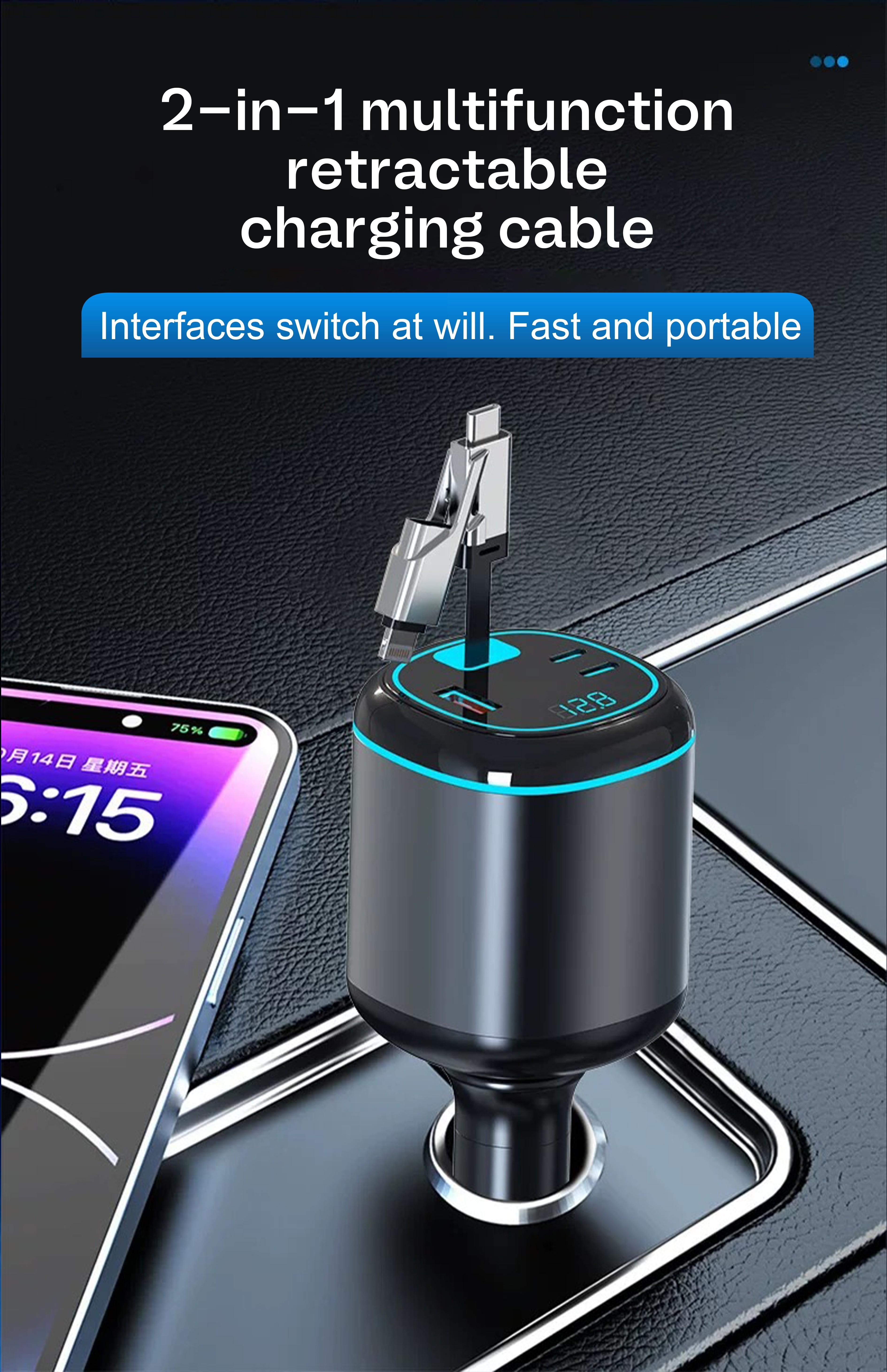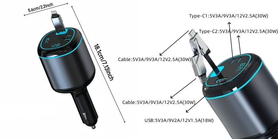 • 96W 5-Port Car Charger: This powerful USB-C retractable car charger features one PD 30W USB-C port, one 12W USB Lightning cable (supporting both 15W USB-C and USB-A), and two Type-C outputs (5V/2.4A). It can charge up to four devices simultaneously, with a total output of 96W, making it ideal for quickly charging phones, laptops, tablets, and more.