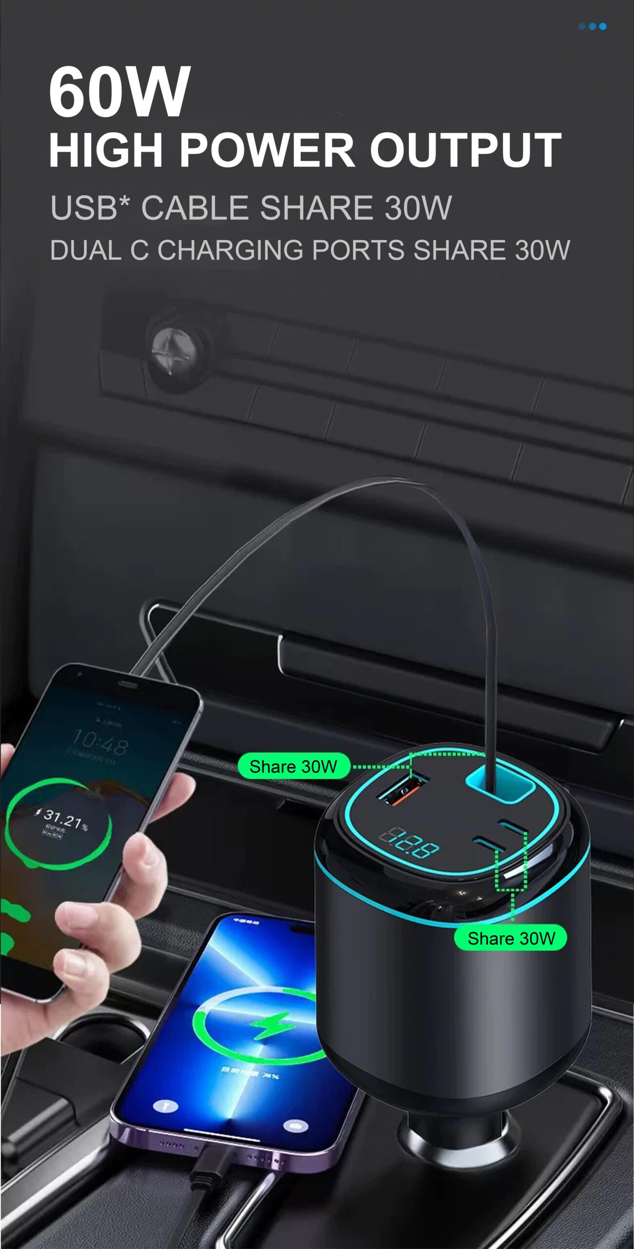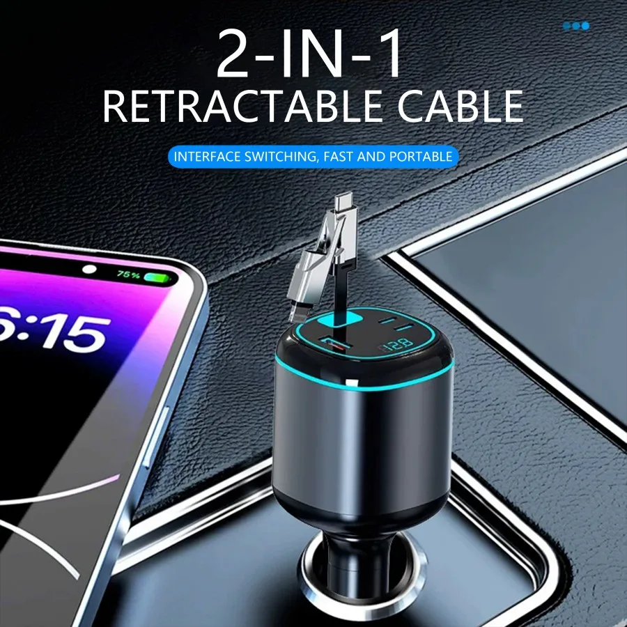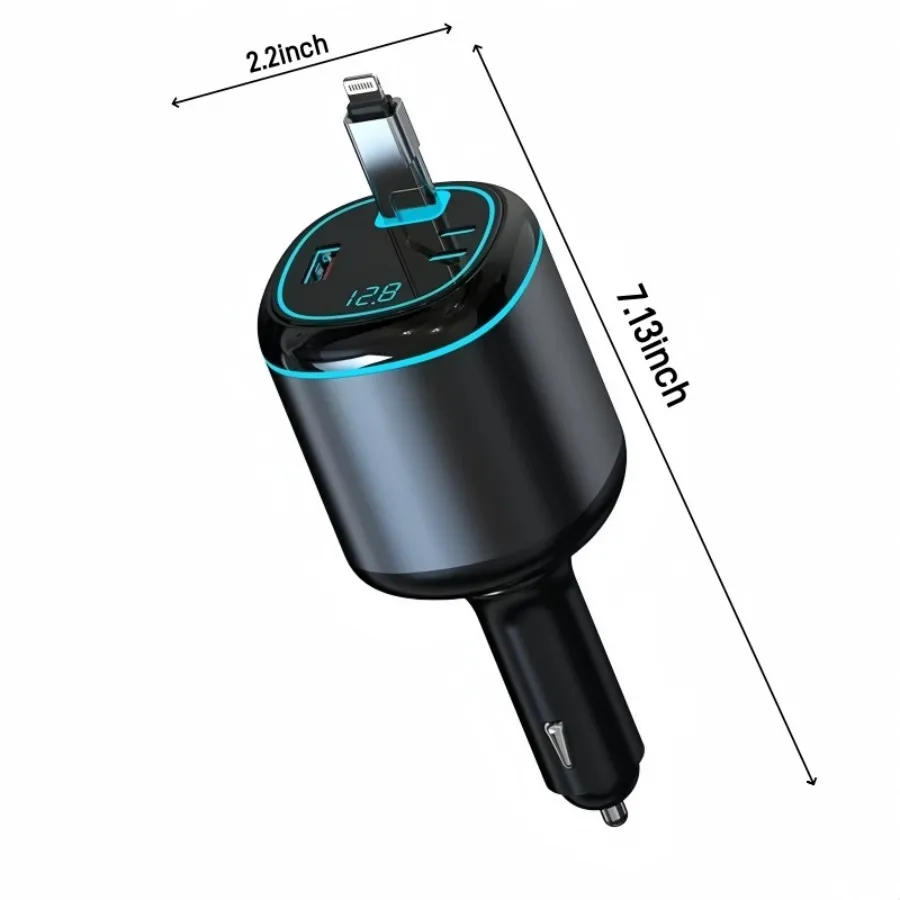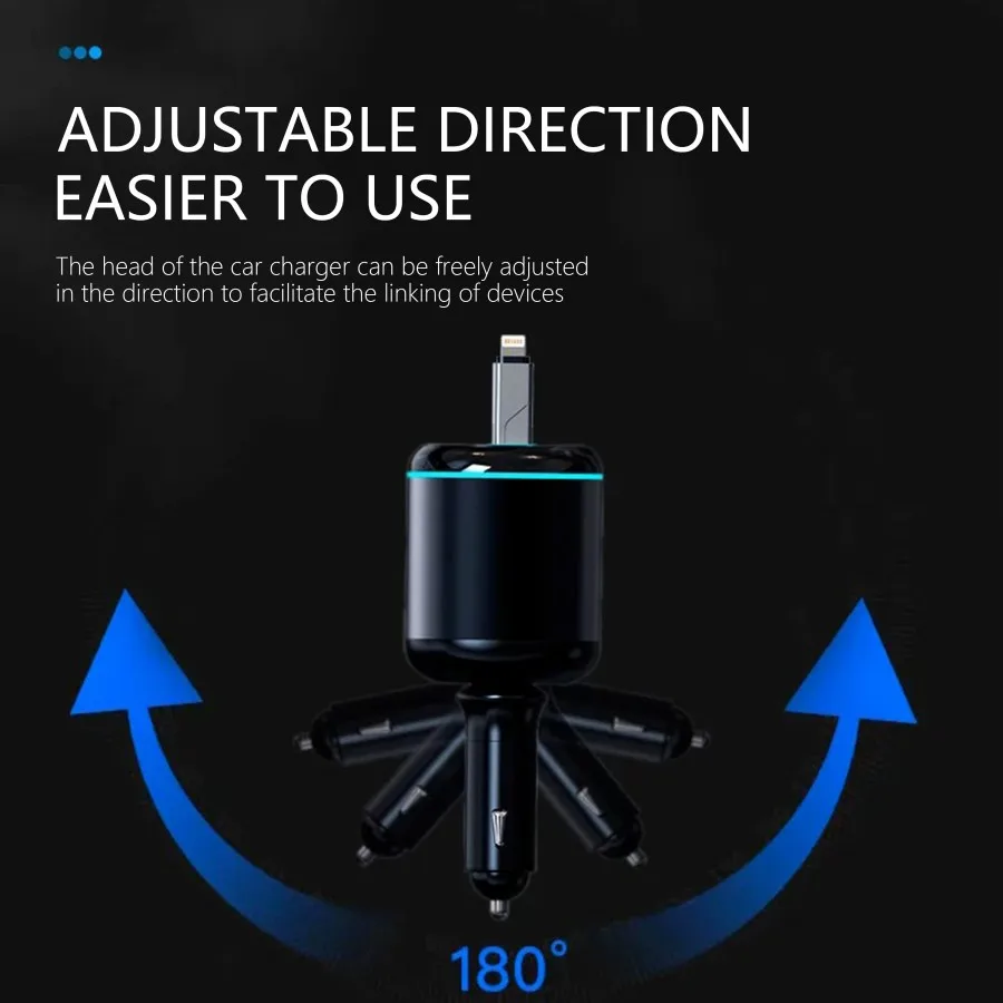 • 96W 5-Port Car Charger: This powerful USB-C retractable car charger features one PD 30W USB-C port, one 12W USB Lightning cable (supporting both 15W USB-C and USB-A), and two Type-C outputs (5V/2.4A). It can charge up to four devices simultaneously, with a total output of 96W, making it ideal for quickly charging phones, laptops, tablets, and more.