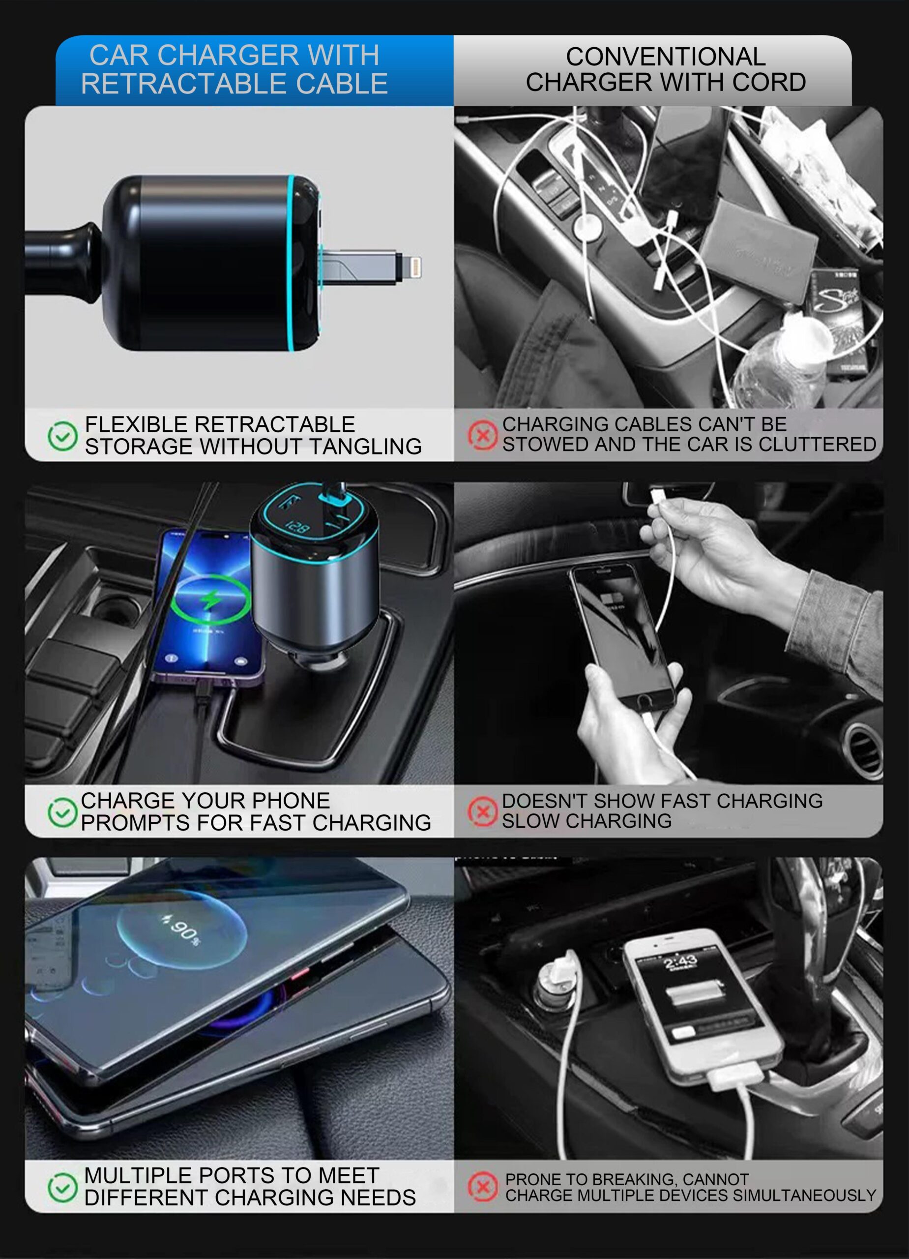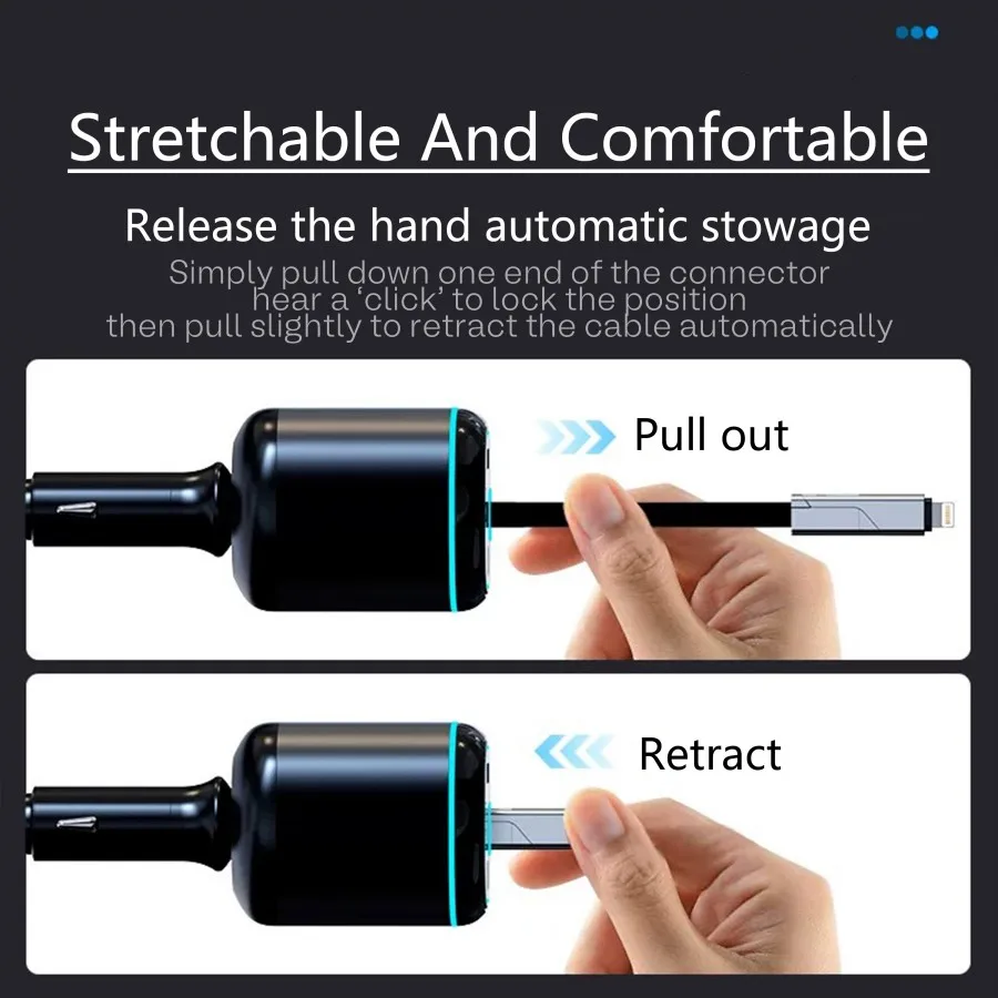 • 90cm Retractable Cable: The NOVORA charger comes with a 90cm retractable cable, the longest available, designed to keep your car organized without tangled cords. Compact and easy to store, it's perfect for cars, SUVs, MPVs, and trucks, offering convenient fast charging for all types of vehicles.