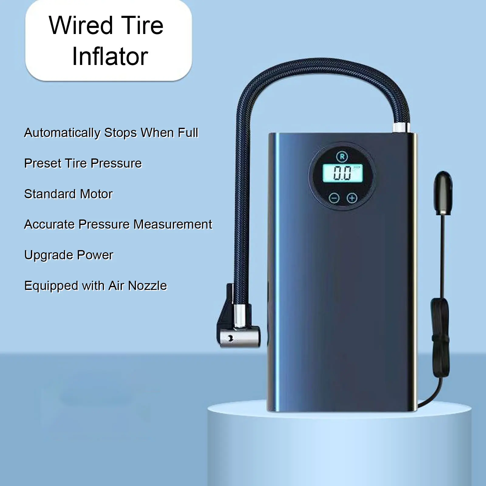 1. Wired Tire Inflator: The electric tire inflation pump is wired in design, which is convenient and easy to connect, ensuring highefficiency inflation.